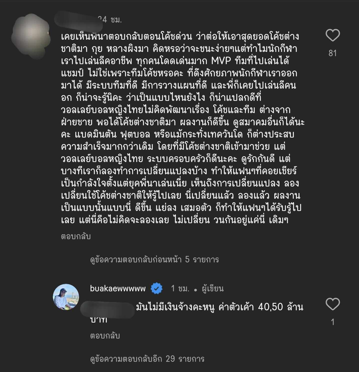 วรรณา บัวแก้ว ได้เข้ามาตอบกลับคอมเมนต์ดังกล่าวอย่างตรงไปตรงมาว่า “มันไม่มีเงินจ้างค่ะหนู ค่าตัวเขา 40-50 ล้านบาท” ซึ่งเป็นการชี้แจงถึงข้อจำกัดด้านงบประมาณของสมาคมฯ ที่ไม่สามารถจ้างโค้ชต่างชาติที่มีค่าตัวสูงได้