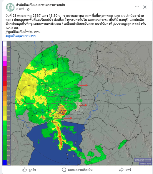 (21 พ.ค. 67) เวลา 18.30 น. – ศูนย์ป้องกันน้ำท่วม กรุงเทพมหานคร รายงานสถานการณ์ฝนตกหนักในพื้นที่กรุงเทพมหานคร โดยมีฝนเล็กน้อยถึงปานกลางปกคลุมบริเวณริมแม่น้ำเจ้าพระยา ต่อเนื่องไปยังพื้นที่ตอนล่างฝั่งธนบุรี และฝนเล็กน้อยกระจายทั่วพื้นที่กรุงเทพฯ โดยเฉพาะอย่างยิ่งในเขตพระนครชั้นใน