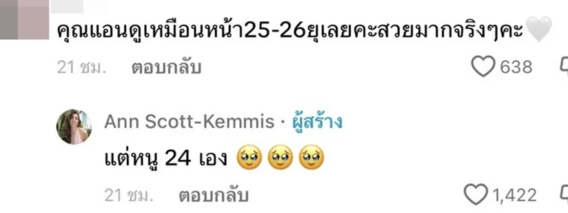 ที่พีคสุดๆ คงจะเป็นคอมเมนต์หนึ่งที่บอกว่า “คุณแอนดูเหมือนหน้า 25-26 อยู่เลยค่ะ สวยมากจริงๆ ค่ะ” แอนชิลีก็ได้ตอบกลับแบบตรงๆ แท้จริงแล้วเธอายุแค่ 24 ปีเท่านั้น