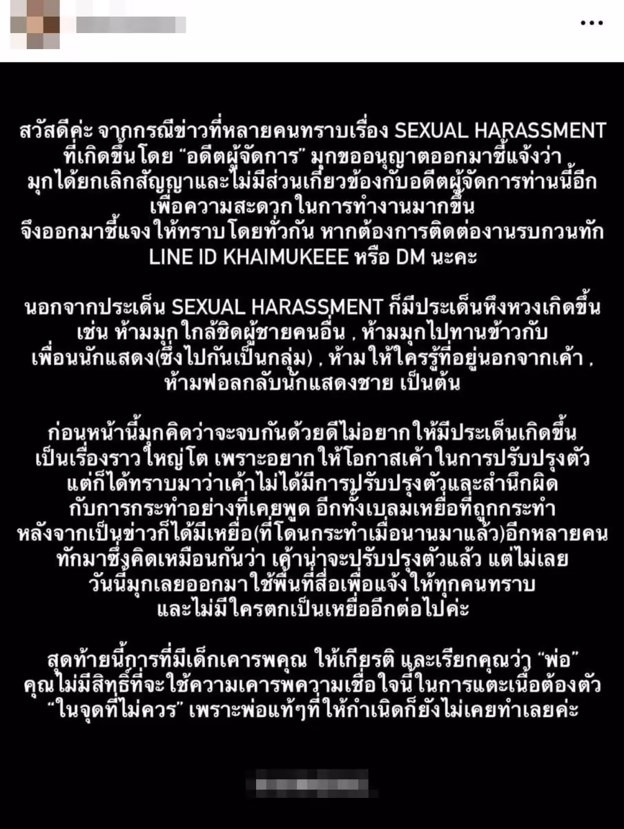นักแสดงสาวกลุ่มนี้เปิดเผยว่า อดีตผู้จัดการคนนี้มักจะข่มขู่และบังคับให้ทำตามคำสั่ง มิฉะนั้นจะไม่มีงานทำ และมีการพูดจาข่มขู่เมื่อนักแสดงสาวเหล่านี้พยายามฉีกสัญญาและออกมาพูดถึงพฤติกรรมที่ไม่เหมาะสมของเขา หลังจากฉีกสัญญา ก็ได้ข่าวว่าอดีตผู้จัดการคนนี้จะฟ้องเพจที่ลงรูป แต่ไม่ได้จะฟ้องตนเอง