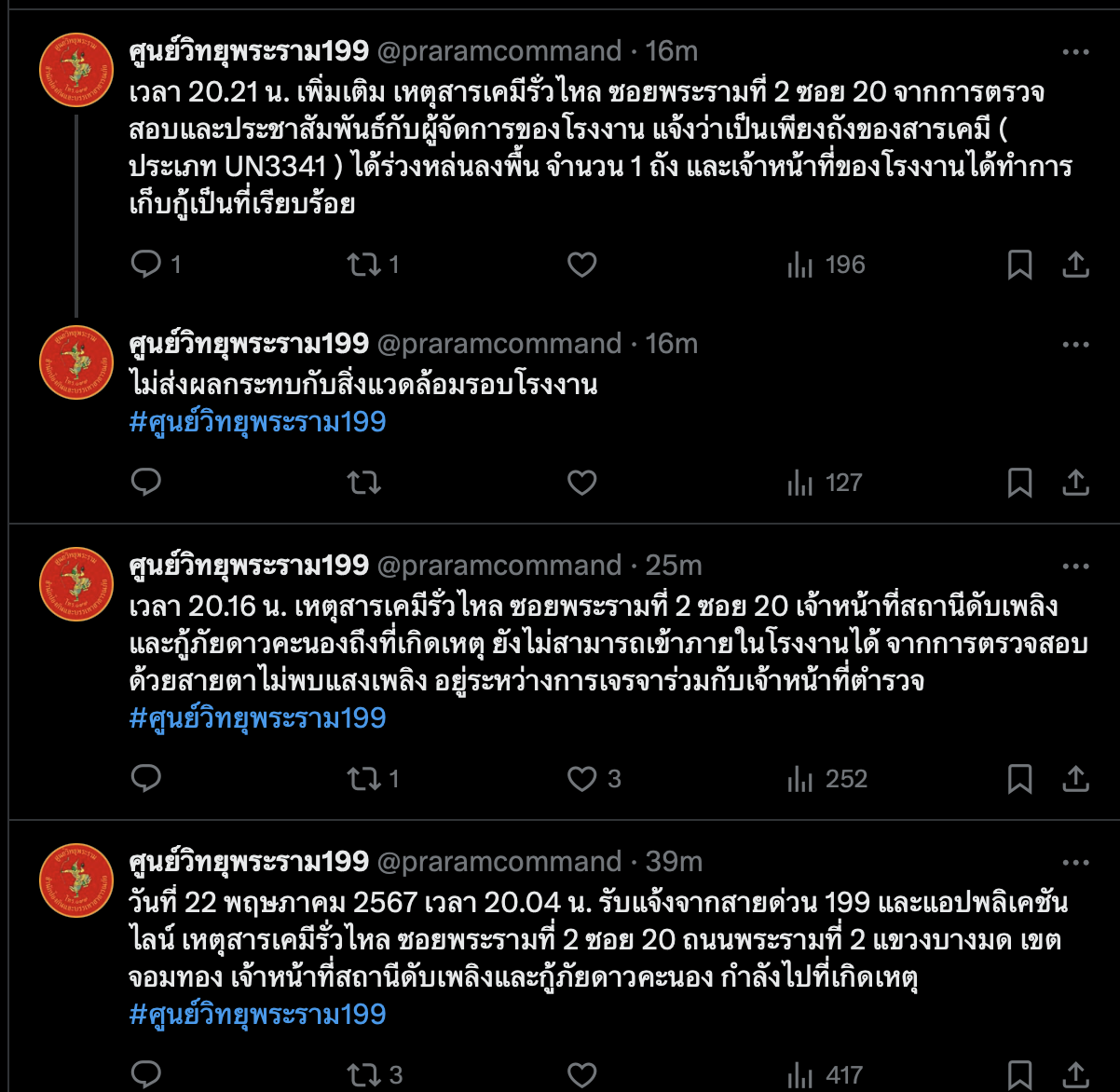 เมื่อวันที่ 22 พฤษภาคม เวลา 20.04 น. ศูนย์วิทยุพระราม 199 ได้รับแจ้งเหตุสารเคมีรั่วไหลผ่านสายด่วน 199 และแอพพลิเคชันไลน์ เหตุการณ์เกิดขึ้นที่ซอยพระรามที่ 2 ซอย 20 ถนนพระรามที่ 2 แขวงบางมด เขตจอมทอง เจ้าหน้าที่จากสถานีดับเพลิงและกู้ภัยดาวคะนองกำลังเร่งไปยังที่เกิดเหตุ