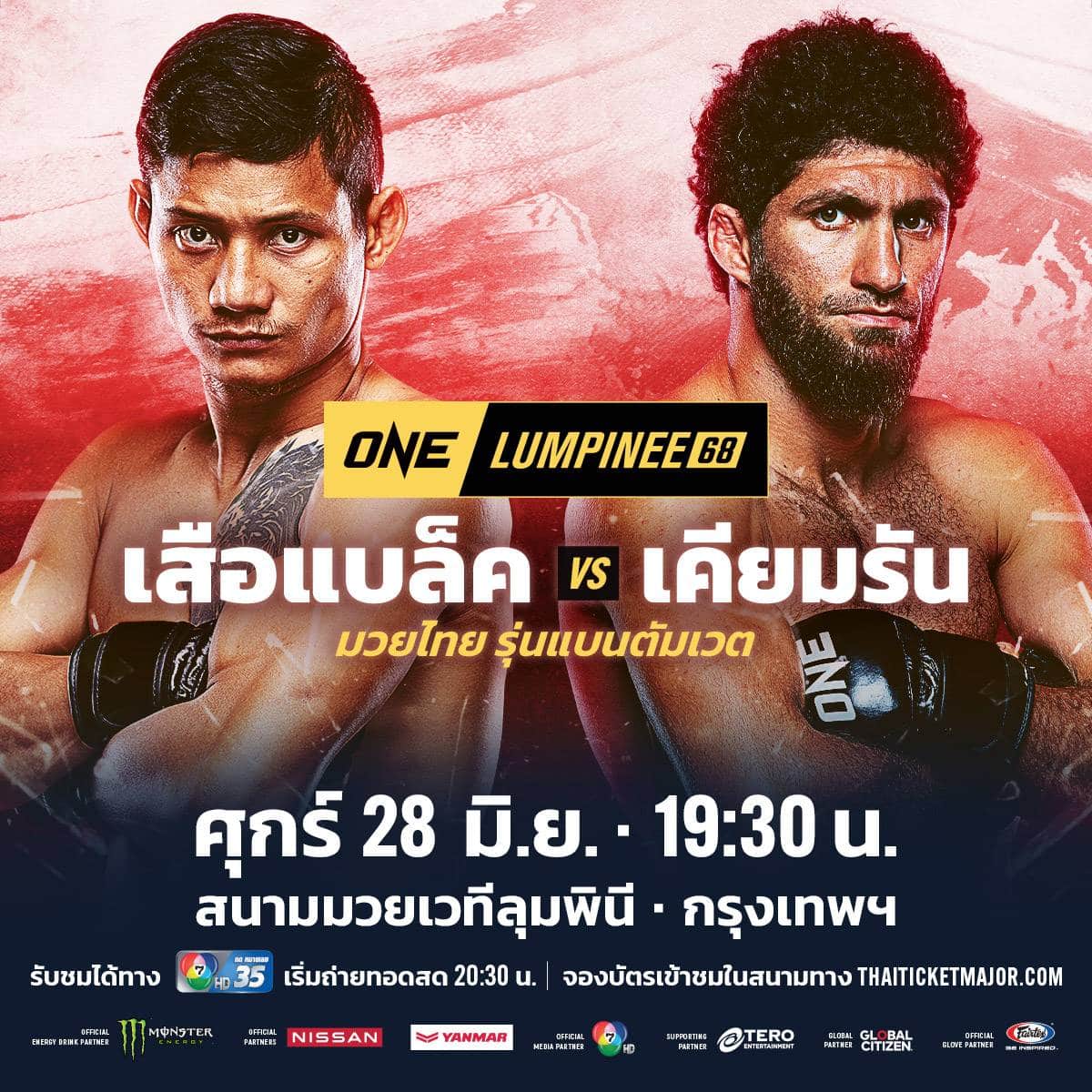 เปิดโปรแกรมเดือดเรียกเสียงฮือฮาจากแฟนกีฬาการต่อสู้อย่างต่อเนื่อง สำหรับศึกนัดยิ่งใหญ่แห่งปี ONE ลุมพินี 68 ที่จะถ่ายทอดสดจากสนามมวยเวทีลุมพินี (รามอินทรา) ในวันศุกร์ที่ 28 มิ.ย.นี้ โดยล่าสุดได้ประกบ “เสือแบล็ค ท.พราน49” นักชกเชื้อสายกะเหรี่ยง วัย 27 ปี จากเพชรบุรี ที่ไฟต์นี้พร้อมทุ่มสุดแรงเกิด เพื่อสะสางบัญชีแค้น “เคียมรัน นาบาติ” นักชกจอมบู๊ ไร้พ่ายจากรัสเซีย ในกติกามวยไทย รุ่นแบนตัมเวต (135-145 ป.)