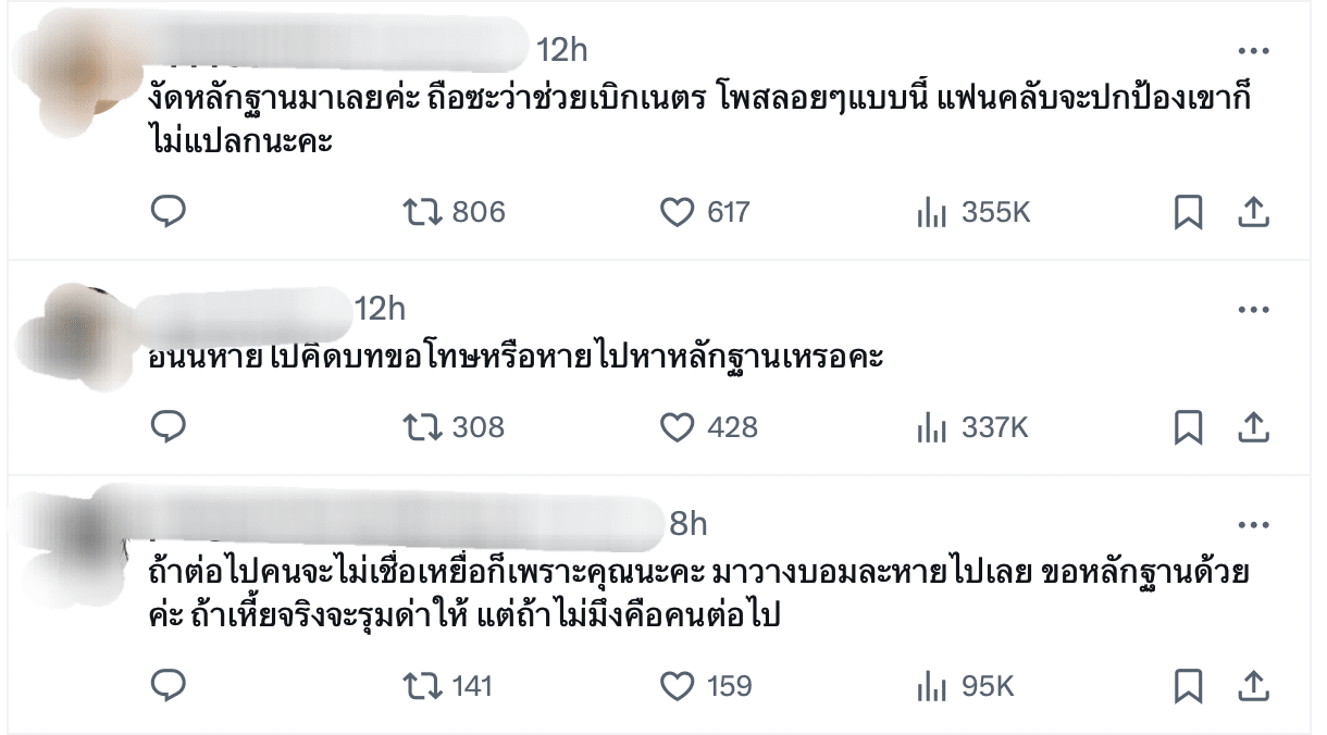 แฟนคลับอีกหลายคนเรียกร้องให้ผู้ปล่อยข่าวนำหลักฐานมาแสดง “ขอหลักฐานด้วยค่ะ คุณกล้าออกมาพูดขนาดนี้แล้วก็กล้างัดหลักฐานด้วยนะคะถ้ามันเป็นความจริงไม่มีใครเอาผิดคุณได้ค่ะ ถ้าเป็นเรื่องจริงคุณโดนด่าหรือโดนทัวร์อะไรก็ต้องมีคนปกป้องอยู่ละแต่นี่อะไรมาวางระเบิดละหายเลย”