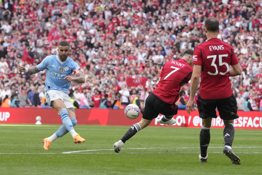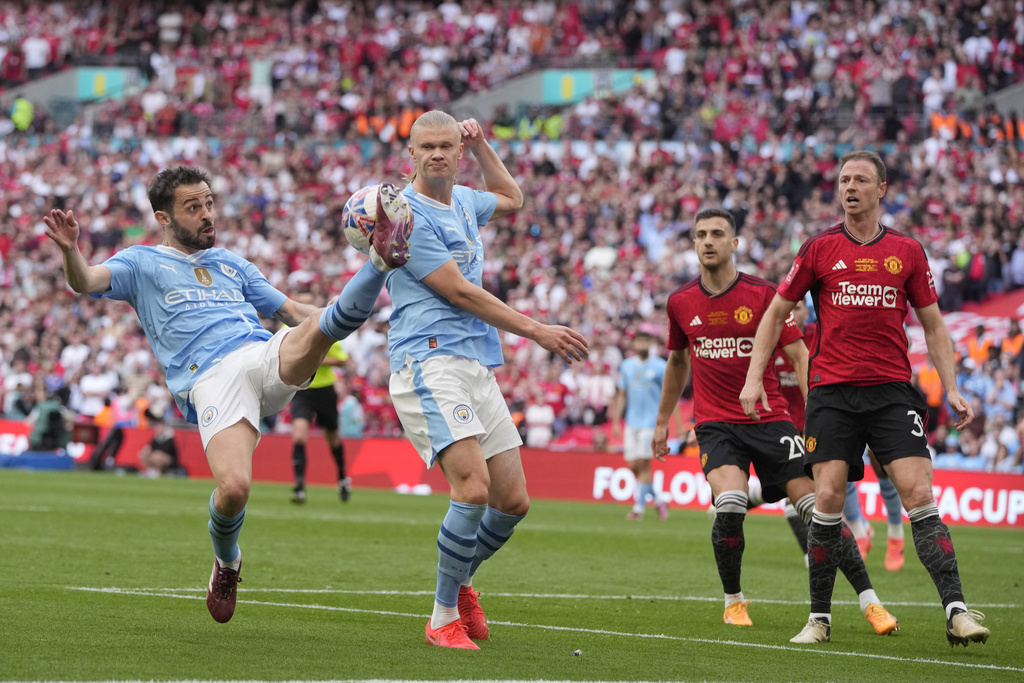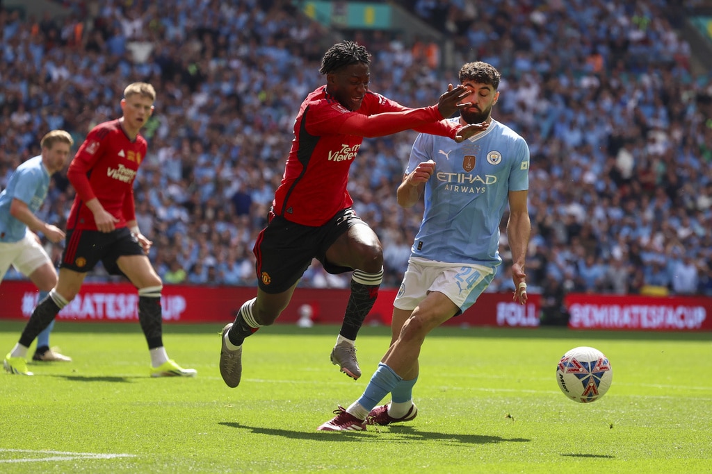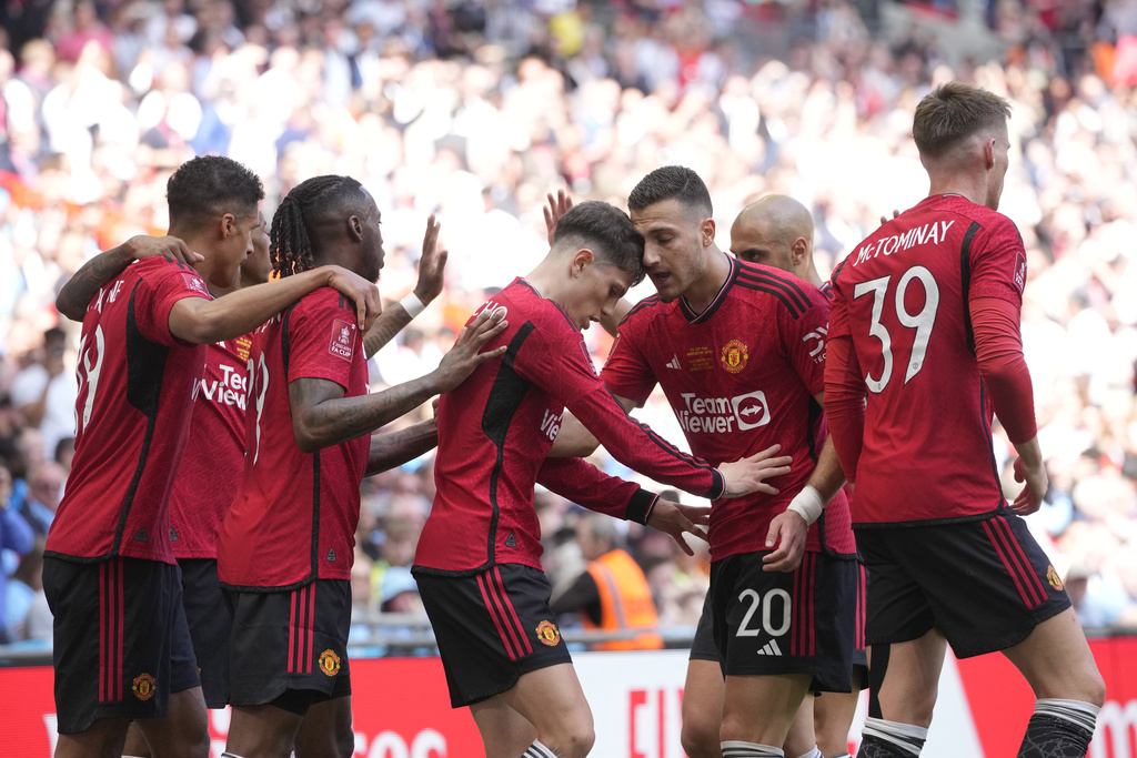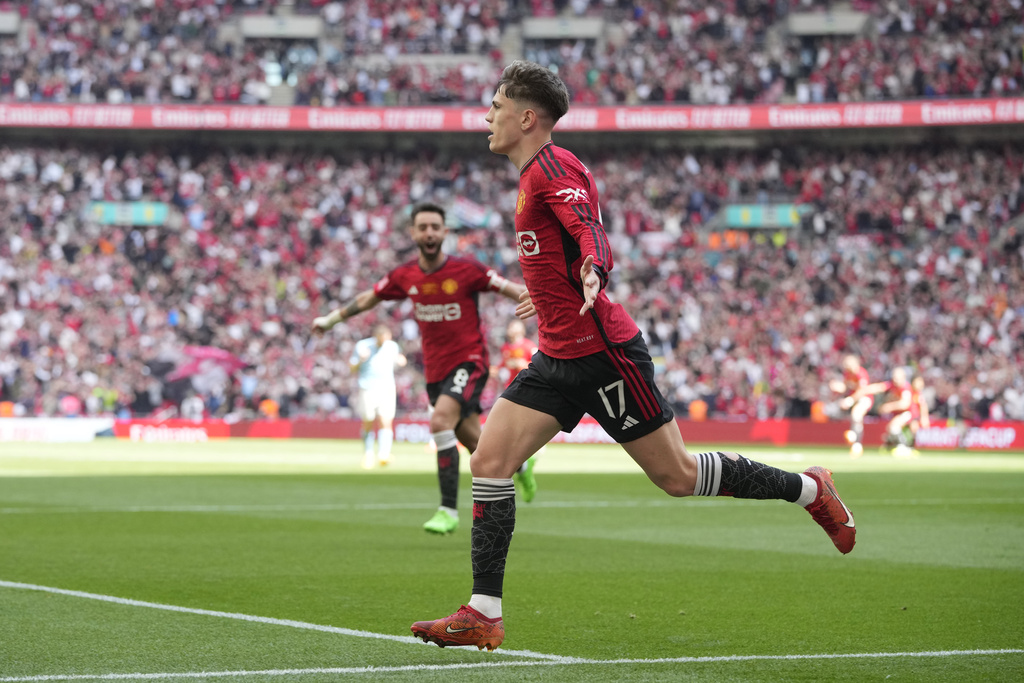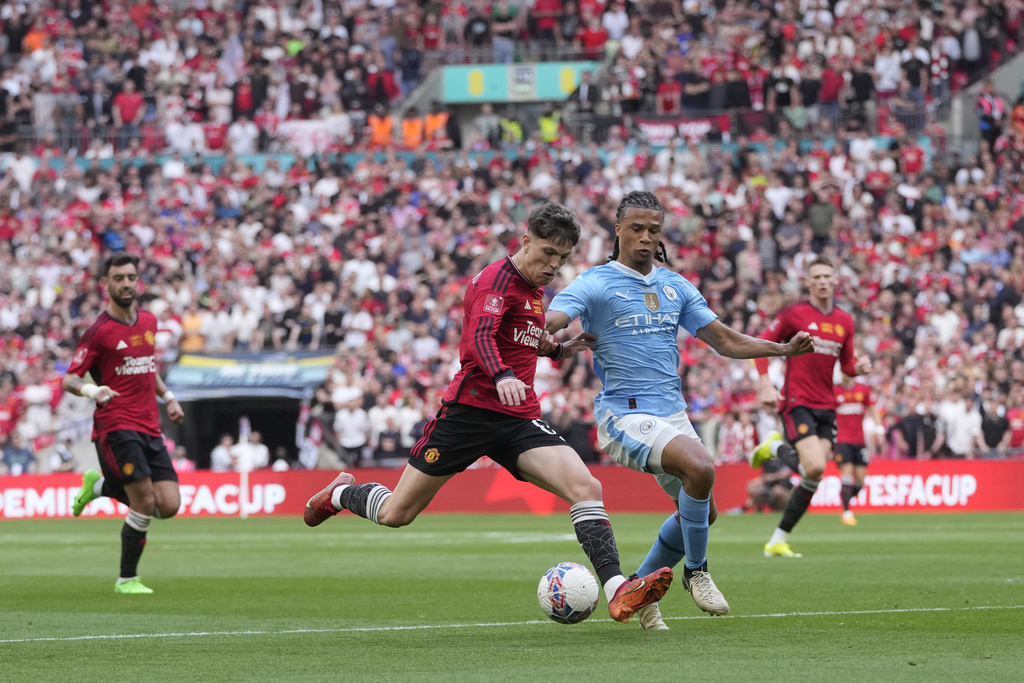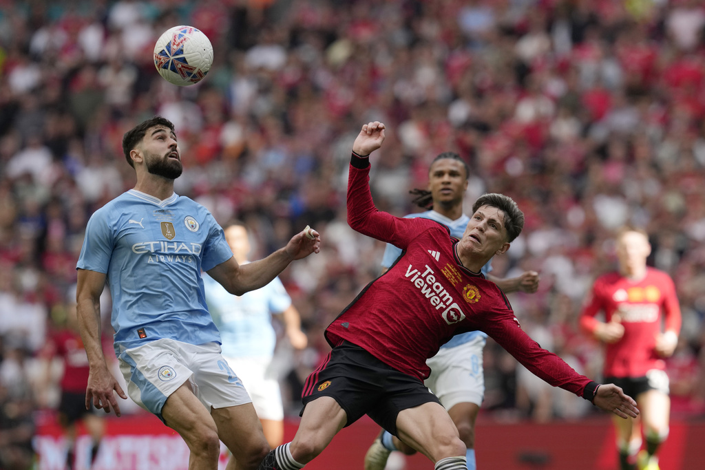 Manchester United’s Scott McTominay, right, fights for the ball with Manchester City’s Mateo Kovacic during the English FA Cup final soccer match between Manchester City and Manchester United at Wembley Stadium in London, Saturday, May 25, 2024. (AP Photo/Kin Cheung)Manchester City’s Kyle Walker, left, attempts a shot at goal in front of Manchester United’s Mason Mount, center, during the English FA Cup final soccer match between Manchester City and Manchester United at Wembley Stadium in London, Saturday, May 25, 2024. (AP Photo/Kin Cheung)Manchester City’s Bernardo Silva, left, controls the ball during the English FA Cup final soccer match between Manchester City and Manchester United at Wembley Stadium in London, Saturday, May 25, 2024. (AP Photo/Kin Cheung)Manchester City’s Erling Haaland, left, and Manchester City’s Bernardo Silva react at the end of the English FA Cup final soccer match between Manchester City and Manchester United at Wembley Stadium in London, Saturday, May 25, 2024. Manchester United won 2-1. (AP Photo/Kin Cheung)Manchester United’s Kobbie Mainoo, left, is tackled by Manchester City’s Josko Gvardiol during the English FA Cup final soccer match between Manchester City and Manchester United at Wembley Stadium in London, Saturday, May 25, 2024. (AP Photo/Ian Walton)Manchester United’s Alejandro Garnacho, left, attempts a shot at goal in front of Manchester City’s Nathan Ake during the English FA Cup final soccer match between Manchester City and Manchester United at Wembley Stadium in London, Saturday, May 25, 2024. (AP Photo/Kin Cheung)Manchester City’s Josko Gvardiol, left, heads the ball to his goalkeeper Manchester City’s goalkeeper Stefan Ortega before Manchester United’s Alejandro Garnacho, center, scores his side’s opening goal during the English FA Cup final soccer match between Manchester City and Manchester United at Wembley Stadium in London, Saturday, May 25, 2024. (AP Photo/Kin Cheung)Manchester United’s Alejandro Garnacho, center, celebrates with his teammates after scoring his side’s opening goal during the English FA Cup final soccer match between Manchester City and Manchester United at Wembley Stadium in London, Saturday, May 25, 2024. (AP Photo/Kin Cheung)Manchester United’s Alejandro Garnacho celebrates after scoring his side’s opening goal during the English FA Cup final soccer match between Manchester City and Manchester United at Wembley Stadium in London, Saturday, May 25, 2024. (AP Photo/Kin Cheung)Manchester United’s Alejandro Garnacho celebrates after scoring his side’s opening goal during the English FA Cup final soccer match between Manchester City and Manchester United at Wembley Stadium in London, Saturday, May 25, 2024. (AP Photo/Kin Cheung)