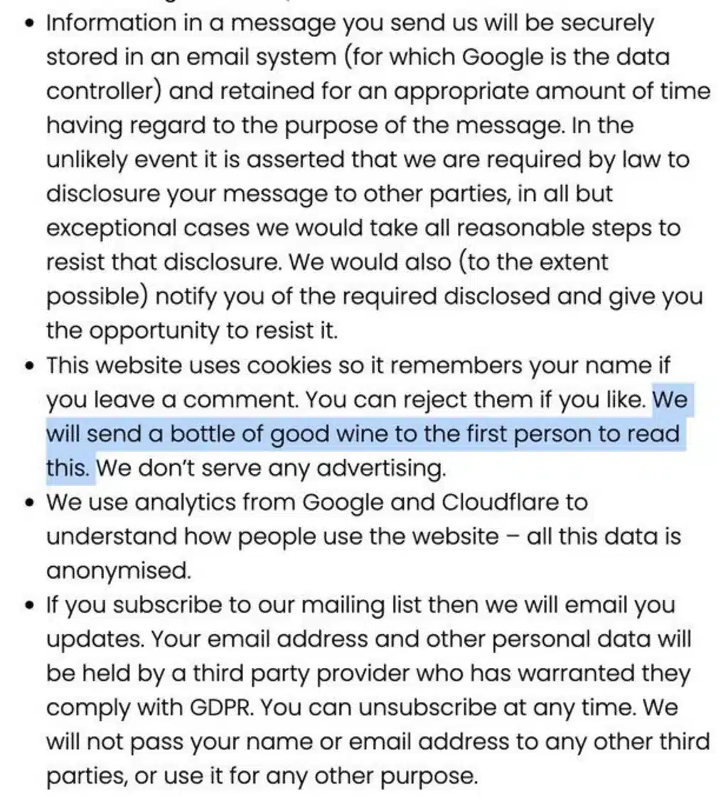 สำนักข่าว BBC รายงานเรื่องราวสุดแปลก หลังจากที่นาย เดน เนย์เดิล หัวหน้าสมาคมนโยบายภาษีในประเทศอังกฤษ ซึ่งเป็นหน่วยงานไม่แสวงหาผลกำไรที่คอยให้คำปรึกษาด้านกฎหมายได้ทำการทดลองใส่ข้อความว่า “พวกเราจะส่งไวน์ชั้นดีให้คนแรกที่อ่านประโยคนี้” ภายในนโยบายด้านความเป็นส่วนตัวบนเว็บไซต์