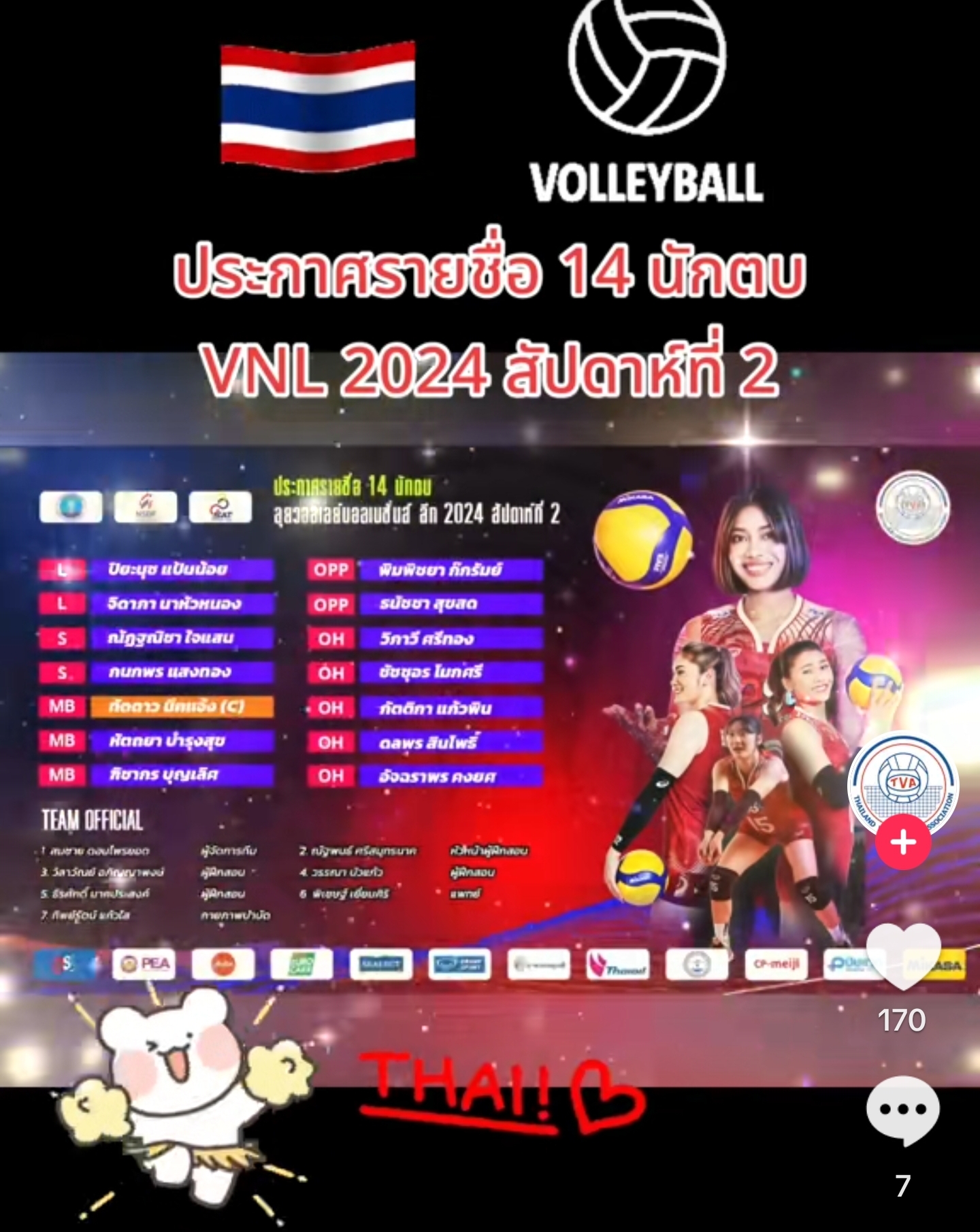 รายชื่อนักวอลเลย์บอลหญิงทีมชาติไทย แข่ง VNL 2024 สัปดาห์ที่ 2 ออกแล้ว