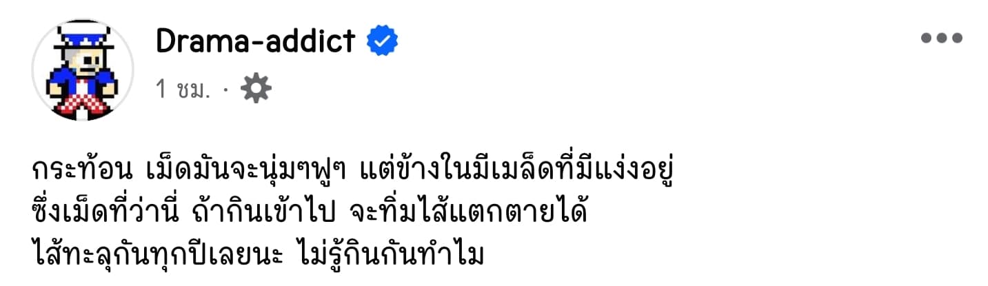ด้านเพจเฟซบุ๊ก Drama-addict ซึ่งเจ้าของเพจเคยเป็นหมอ ให้ความรู้ว่า “กระท้อน เม็ดมันจะนุ่มๆฟูๆ แต่ข้างในมีเมล็ดที่มีแง่งอยู่ เม็ดที่ว่านี่ ถ้ากินเข้าไป จะทิ่มไส้แตกตายได้ ไส้ทะลุกันทุกปีเลยนะ ไม่รู้กินกันทำไม”