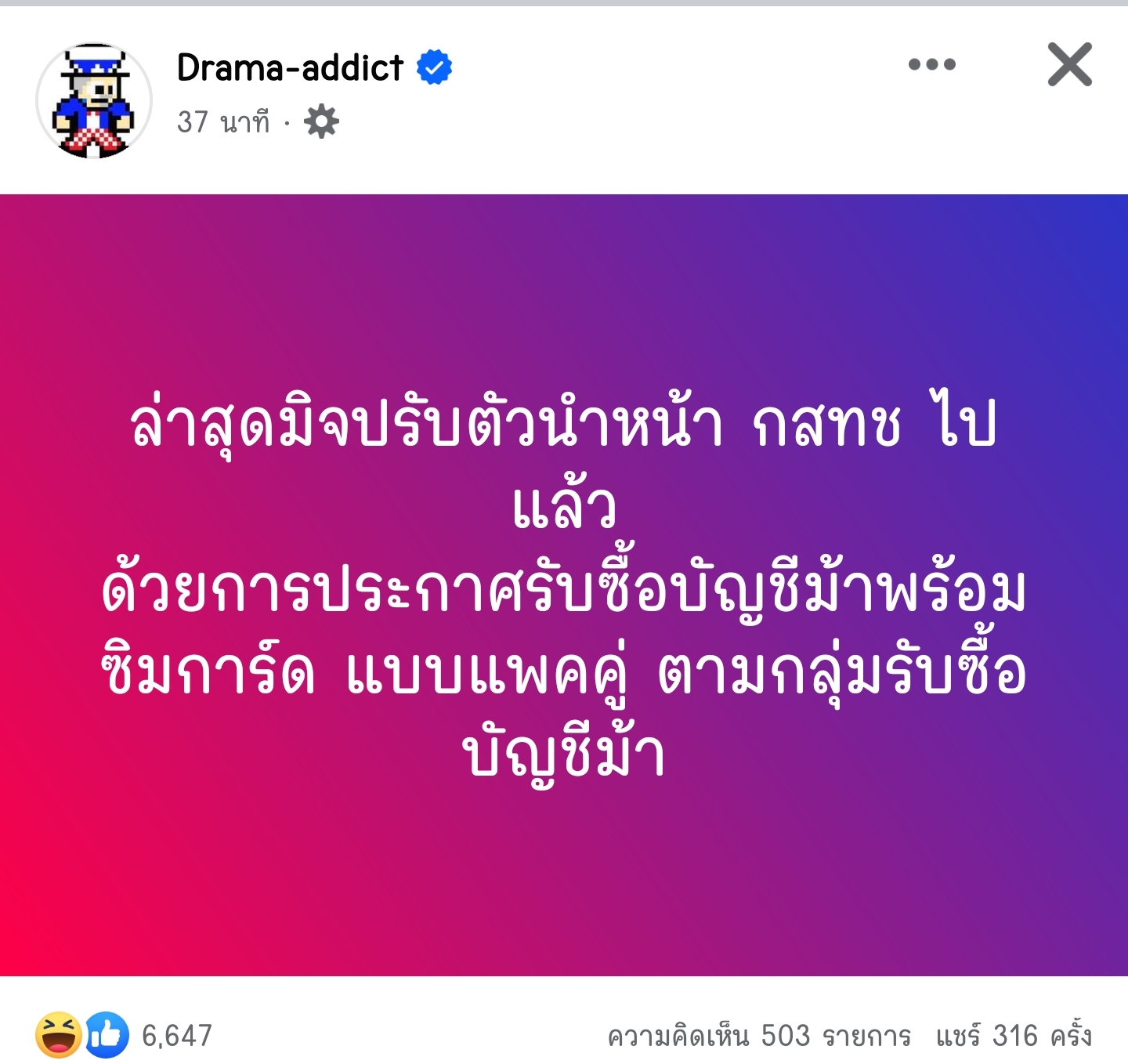 ล่าสุด เพจเฟซบุ๊ก drama-addict รายงานว่า มิจฉาชีพก็แสบไม่เบา ปรับตัวอย่างรวดเร็ว ล่าสุดประกาศรับซื้อบัญชีม้าพร้อมซิมการ์ดแบบแพ็คคู่ในกลุ่มต่างๆ