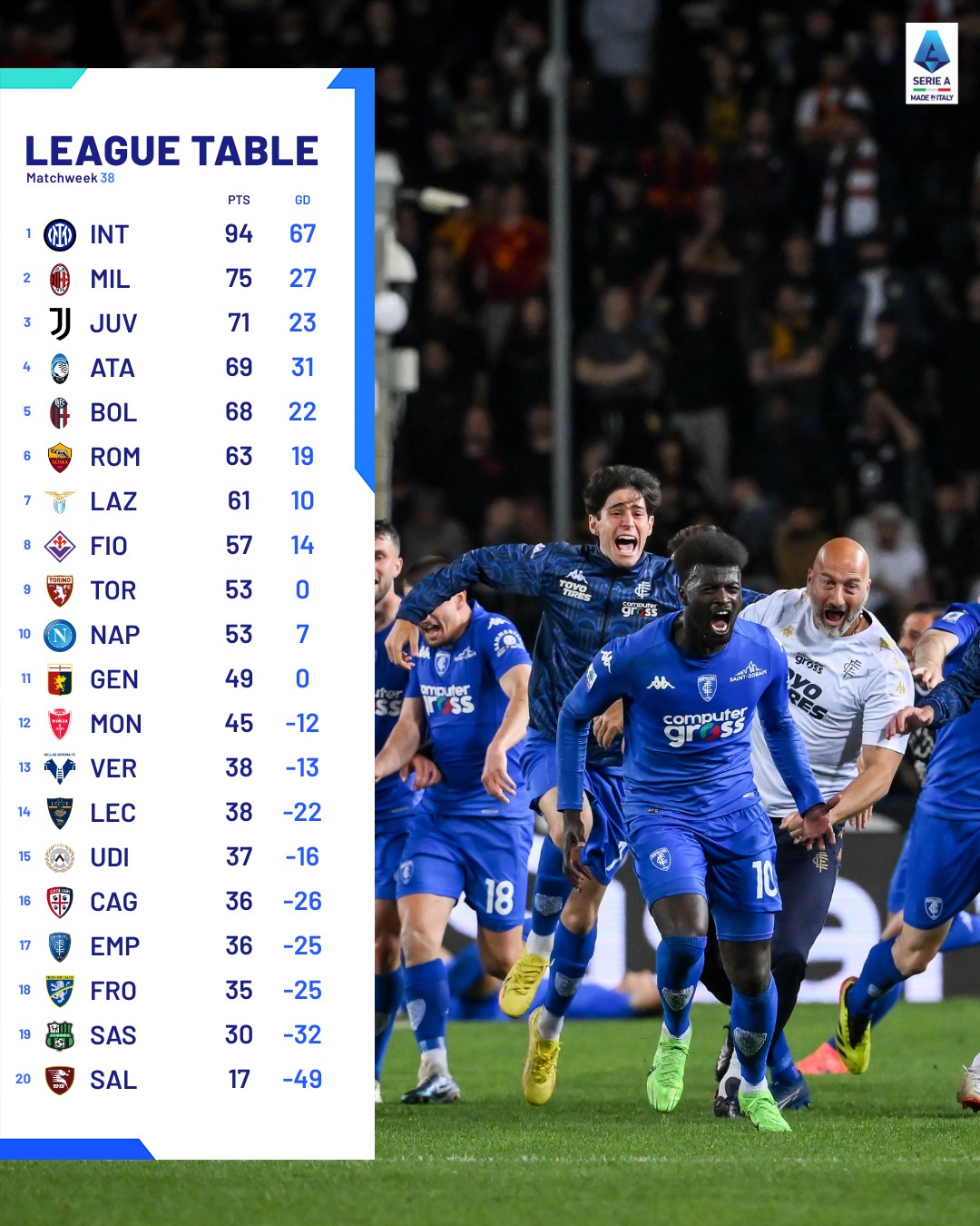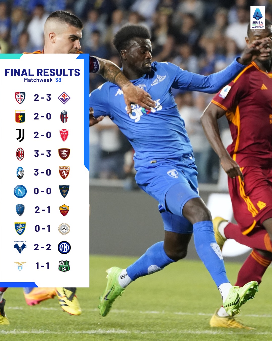 สรุปผลการแข่งขัน กัลโช่ เซเรียอา 2023/24 หลังจบนัดที่ 38