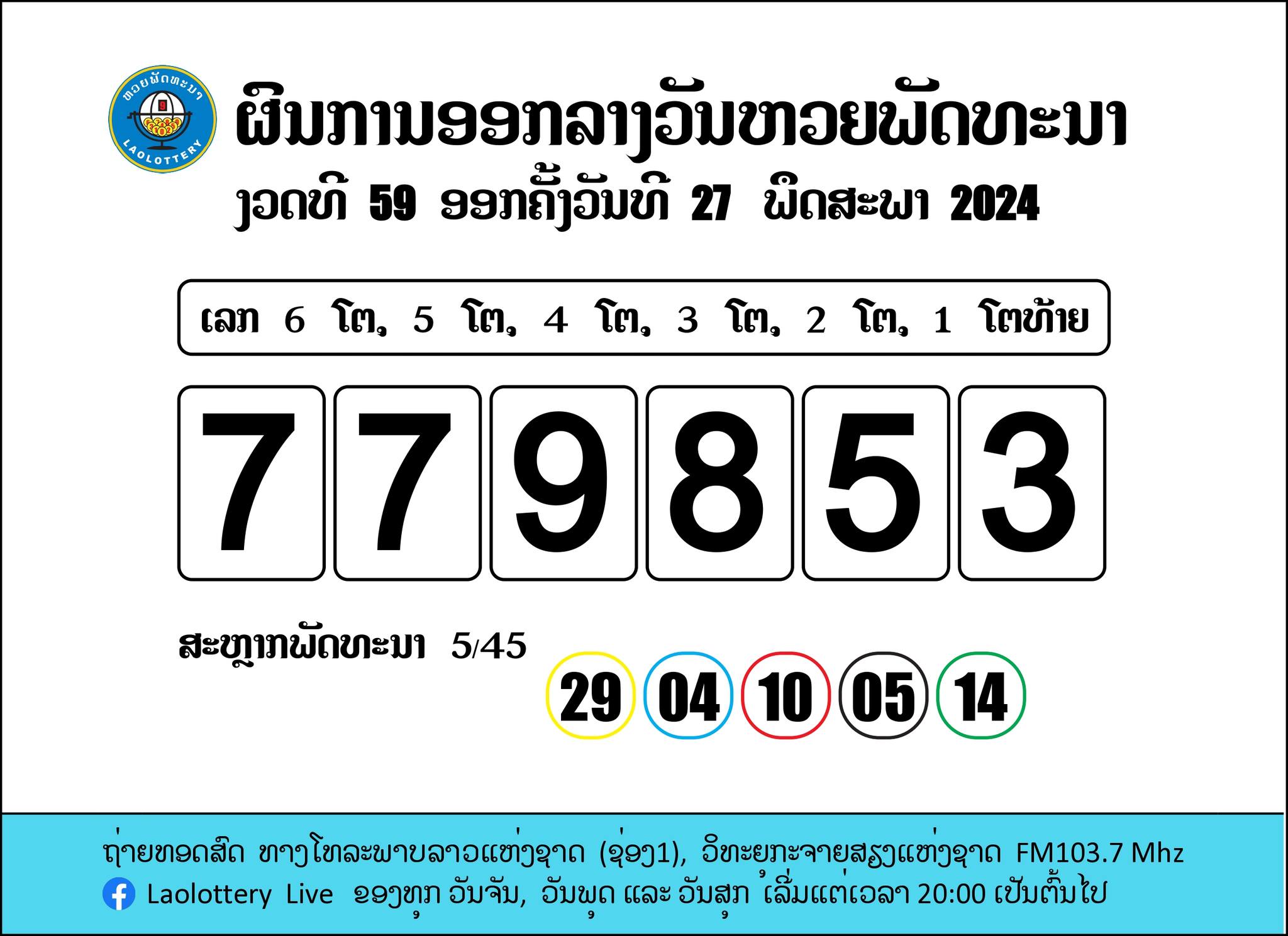 ประกาศผลรางวัลสลากพัฒนา (หวยลาว) งวดวันที่ 27 พฤษภาคม 2567