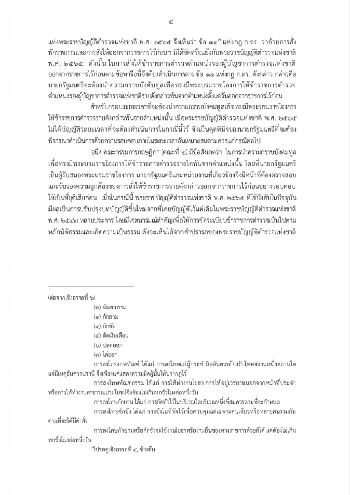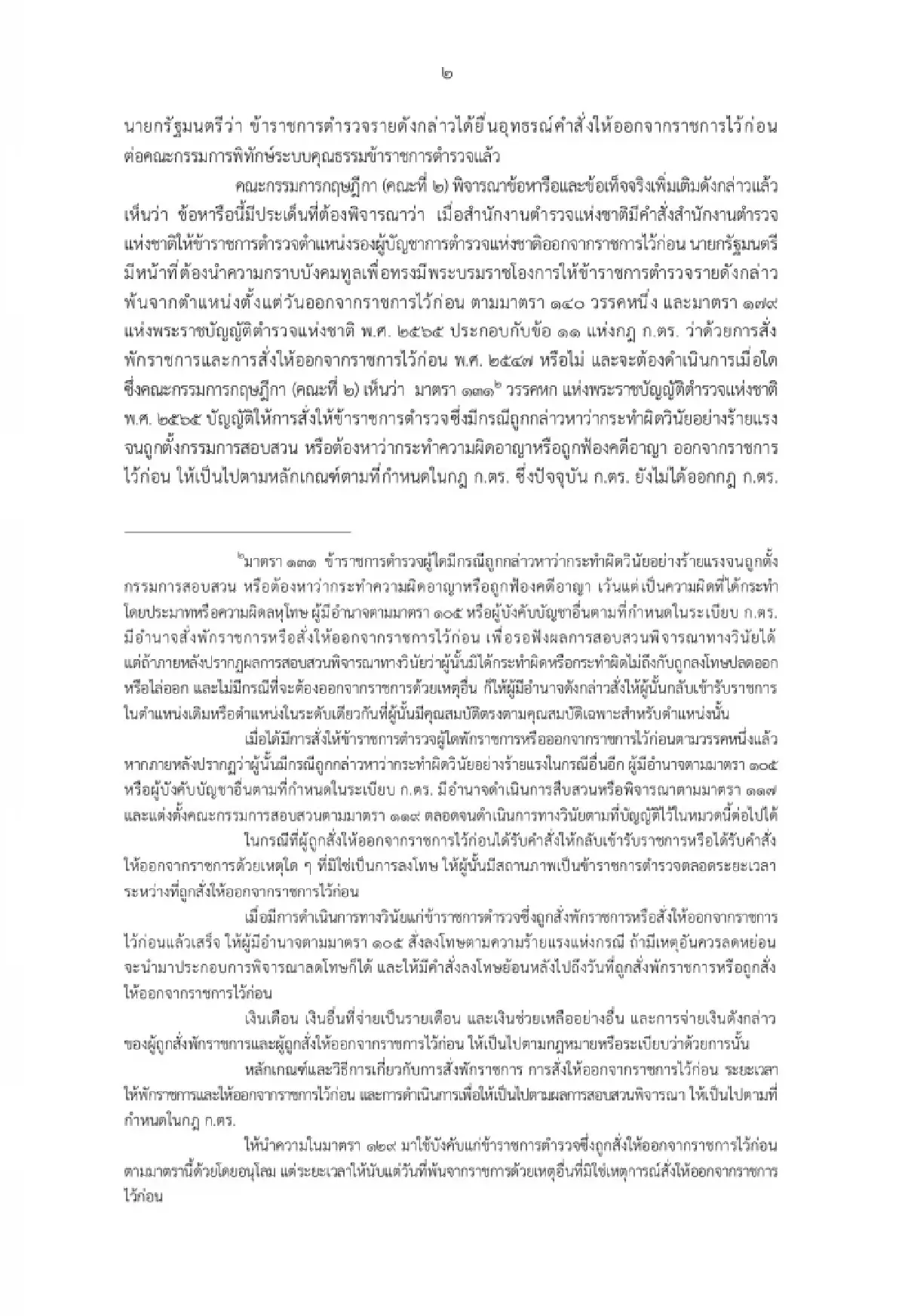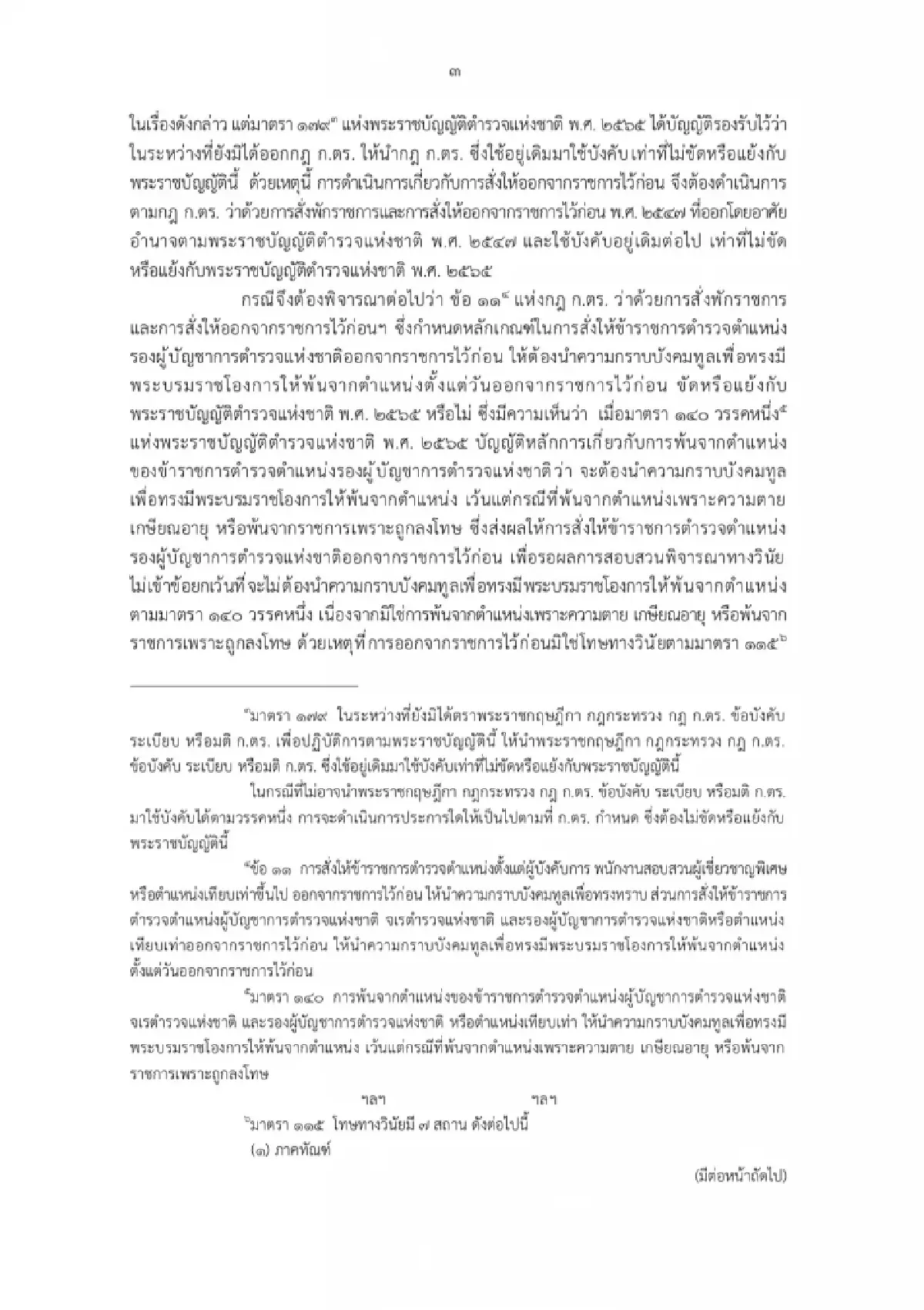 ซึ่งมีความเห็นว่า เมื่อมาตรา 140 วรรคหนึ่ง แห่ง พ.ร.บ.ตำรวจแห่งชาติ พ.ศ.2565 บัญญัติหลักการเกี่ยวกับการพ้นจากตำแหน่งของข้าราชการตำรวจตำแหน่งรองผบ.ตร.ว่าจะต้องนำความกราบบังคมทูล เพื่อทรงมีพระบรมราชโองการให้พ้นจากตำแหน่ง เว้นแต่กรณีที่พ้นจากตำแหน่งเพราะความตาย เกษียณอายุ หรือพ้นจากราชการเพราะถูกลงโทษ ซึ่งส่งผลให้การสั่งให้ข้าราชการตำรวจตำแหน่งรองผบ.ตร.ออกจากราชการไว้ก่อน เพื่อรอผลการสอบสวนพิจารณาทางวินัย ไม่เข้าข้อยกเว้น ที่จะไม่ต้องนำความกราบบังคมทูลเพื่อทรงมีพระบรมราชโองการให้พ้นจากตำแหน่งตามมาตรา 140 วรรคหนึ่ง เนื่องจากมิใช่การพ้นจากตำแหน่งเพราะความตาย เกษียณอายุ หรือพ้นจากราชการเพราะถูกลงโทษ ด้วยเหตุที่การออกจากราชการไว้ก่อน มิใช่โทษทางวินัยตามมาตรา 115 แห่งพ.ร.บ.ตำรวจแห่งชาติ พ.ศ.2565