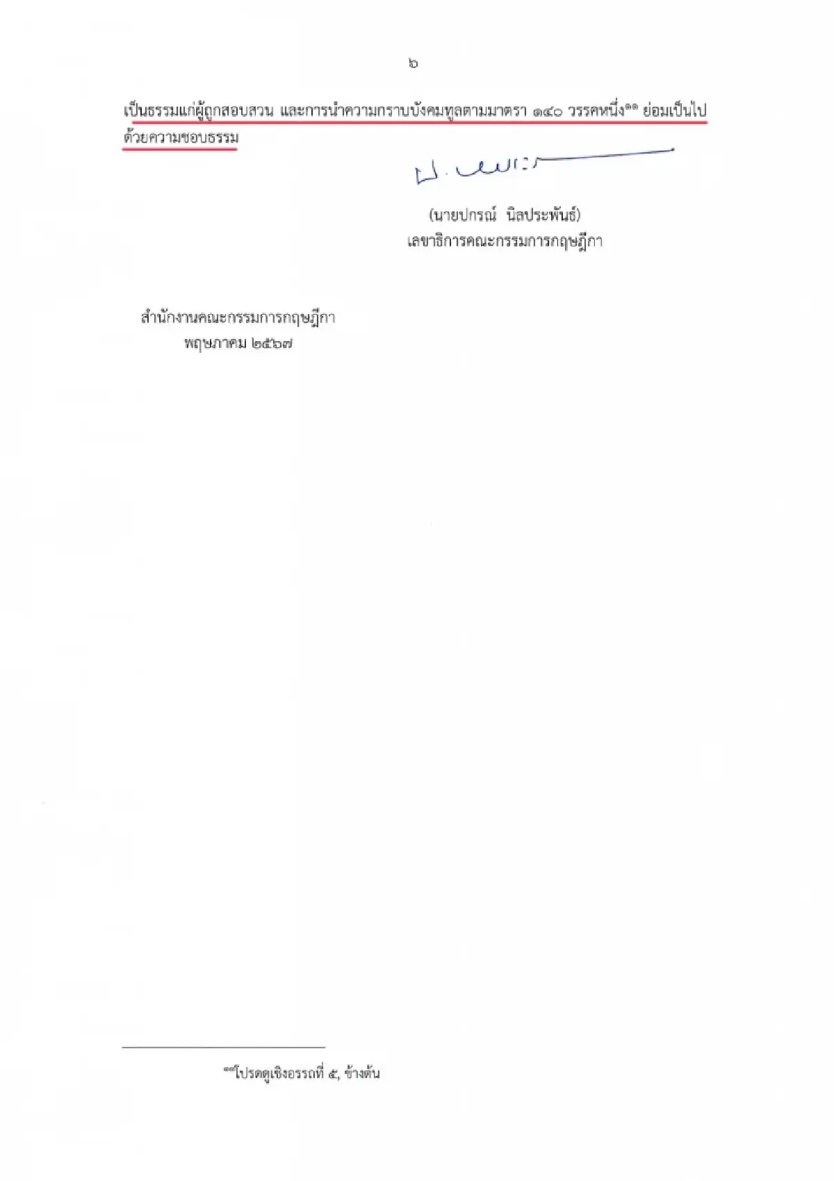 กรณีจึงเห็นได้ว่า การสั่งให้ข้าราชการตำรวจรายนี้ออกจากราชการไว้ก่อนหากเป็นการปฏิบัติตามคำแนะนำของคณะกรรมการสอบสวนที่ตั้งขึ้น ย่อมจะทำให้การพิจารณาเหตุแห่งการกระทบสิทธิของผู้นั้น และความจำเป็นที่จะต้องสั่งให้ผู้นั้นออกจากข้าราชการไว้ก่อน ชอบด้วยกระบวนการตามกฎหมายและเป็นธรรมแก่ผู้ถูกสอบสวน และการนำความกราบบังคมทูลตามมาตรา 140 วรรคหนึ่ง ย่อมเป็นไปด้วยความชอบธรรม