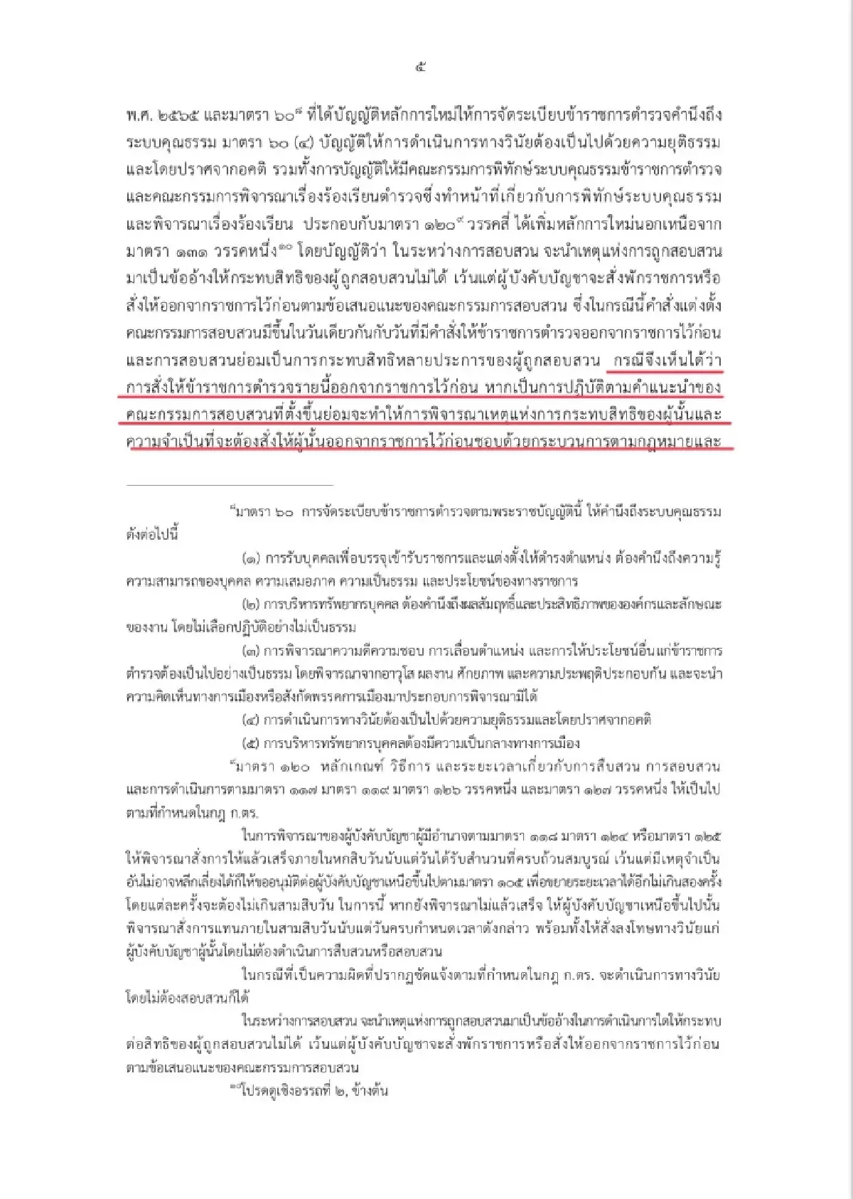 เมื่อในกรณีนี้พ.ร.บ.ตำรวจแห่งชาติ พ.ศ.2565 ที่ใช้บังคับในปัจจุบัน มีผลเป็นการปรับปรุงบทบัญญัติขึ้นมาใหม่ จากที่เคยบัญญัติไว้แต่เดิมในพ.ร.บ.ตำรวจแห่งชาติ พ.ศ.2565 หลายประการ โดยมีเจตนารมณ์สำคัญเพื่อให้การจัดระเบียบข้าราชการตำรวจเป็นไปตามหลักนิติธรรม และเกิดความเป็นธรรม ดังจะเห็นได้จากคำปรารภของพ.ร.บ.ตำรวจแห่งชาติ พ.ศ.2565 และมาตรา 60 ที่ได้บัญญัติหลักการใหม่ ให้การจัดระเบียบข้าราชการตำรวจคำนึงถึงระบบคุณธรรม มาตรา 60(4) บัญญัติให้การดำเนินการทางวินัยต้องเป็นไปด้วยความยุติธรรม และโดยปราศจากอคติ รวมทั้งบัญญัติให้มีคณะกรรมการพิทักษ์ระบบคุณธรรมข้าราชการตำรวจและคณะกรรมการพิจารณาเรื่องร้องเรียนตำรวจ ซึ่งทำหน้าที่เกี่ยวกับการพิทักษ์ระบบคุณธรรม และพิจารณาเรื่องร้องเรียนประกอบกับมาตรา 120 วรรค 4 ได้เพิ่มหลักการใหม่นอกเหนือจากมาตรา 131 วรรคหนึ่ง