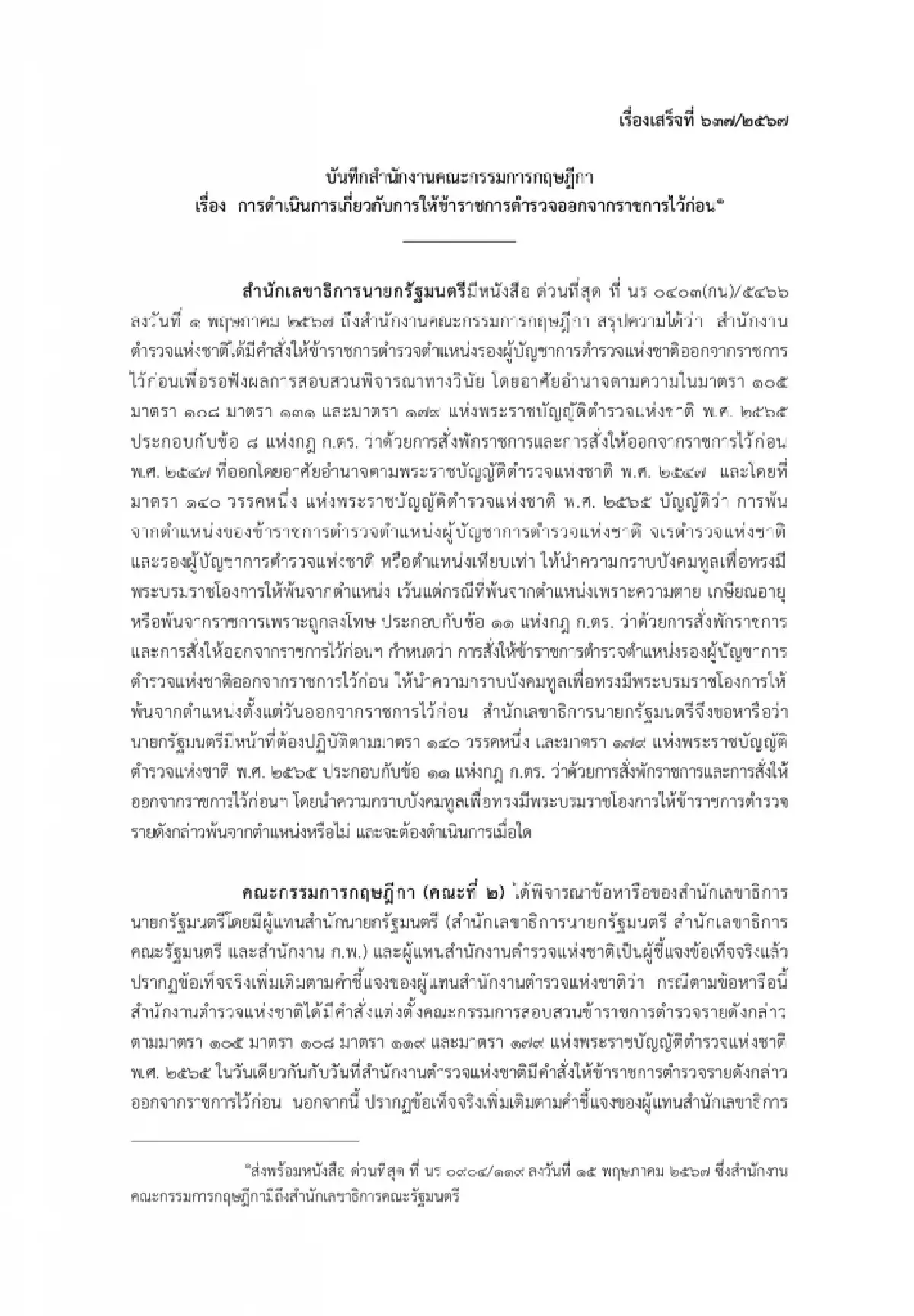 จากการตรวจสอบเอกสาร พบว่าเนื้อหาระบุว่า คณะกรรมการกฤษฎีกา (คณะที่ 2) ได้พิจารณาข้อหารือของสำนักงานเลขาธิการนายกรัฐมนตรี โดยมีผู้แทนสำนักนายกรัฐมนตรี (สำนักเลขาธิการนายกรัฐมนตรี สำนักเลขาธิการคณะรัฐมนตรี และสำนักงาน ก.พ.) และผู้แทนสำนักงานตำรวจแห่งชาติ(ตร.) เป็นผู้ชี้แจงข้อเท็จจริงแล้ว ปรากฏข้อเท็จจริงเพิ่มเติม ตามคำชี้แจงของผู้แทน ตร.ว่า