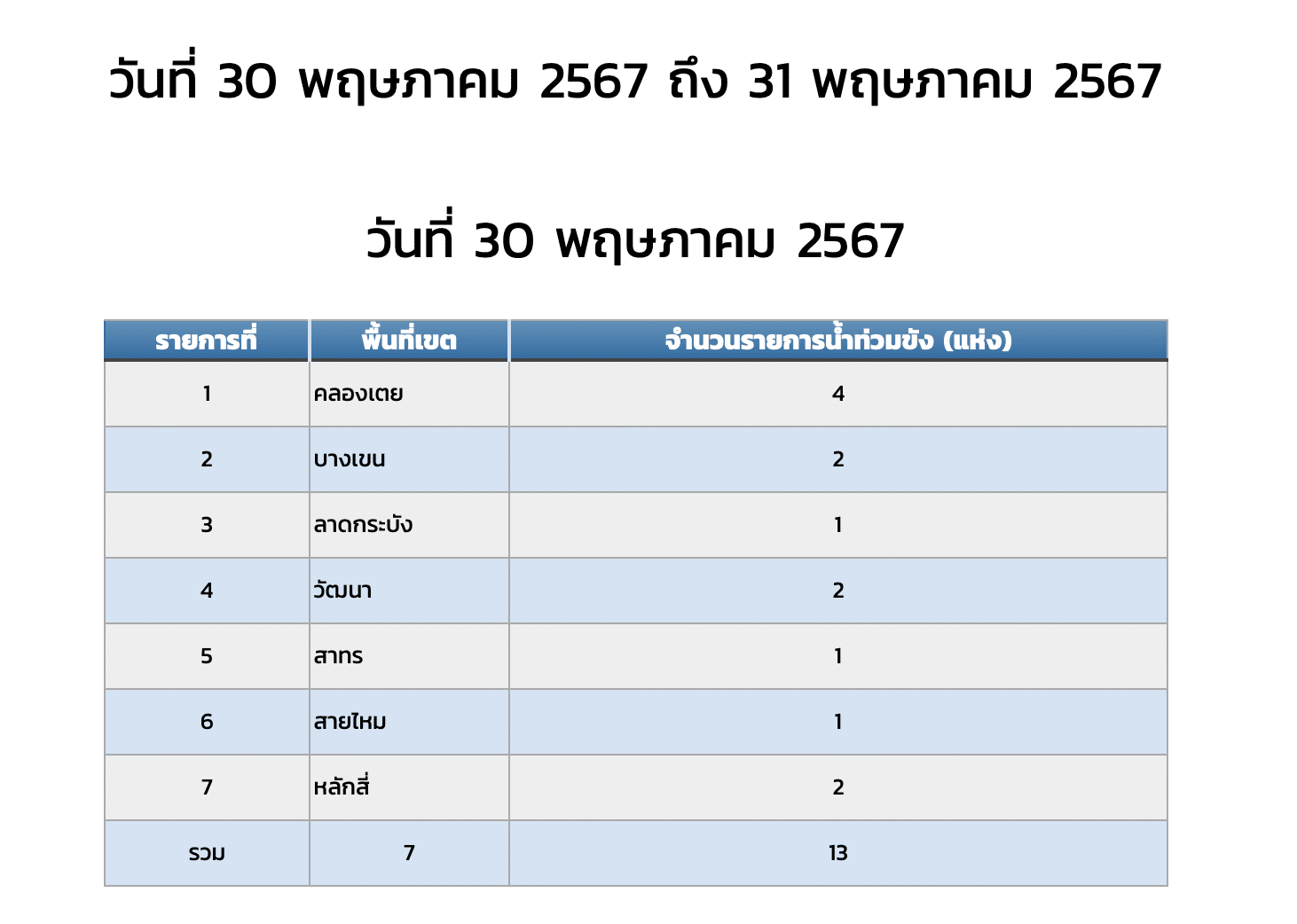 ในช่วง 24 ชั่วโมงที่ผ่านมา มีรายงานฝนตกหนักวัดปริมาณสูงสุดได้ถึง 115 มิลลิเมตร ที่เขตคลองเตย และมีรายงานจุดเร่งระบายน้ำ 13 จุด ใน 7 เขตพื้นที่ ได้แก่ คลองเตย บางเขน ลาดกระบัง วัฒนา สาทร สายไหม หลักสี่