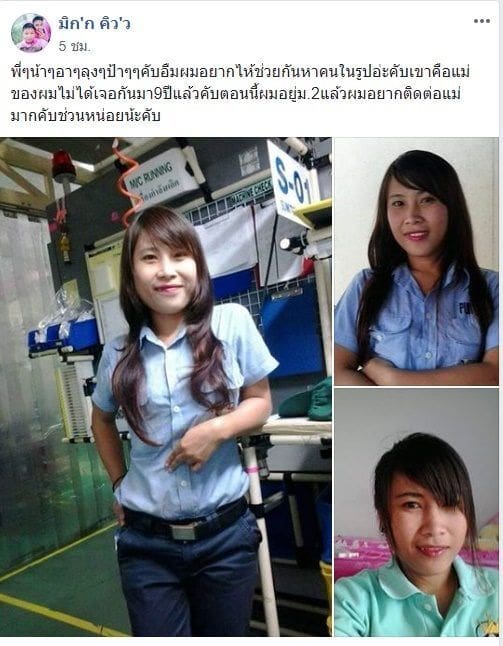ผู้ใช้เฟซบุ๊กรายหนึ่งได้โพสต์ข้อความและรูปภาพ ซึ่งโดยระบุว่า พี่ๆ น้าๆ อาๆ ลุงๆ ป้าๆ ครับ ผมอยากให้ช่วยกันหาคนในรูปครับ เขา คือ แม่ของผมไม่ได้เจอกันมา 9 ปี แล้วครับตอนนี้ผมอยู่ม.2 แล้ว ผมอยากติดต่อแม่มากครับช่วยหน่อยนะครับ