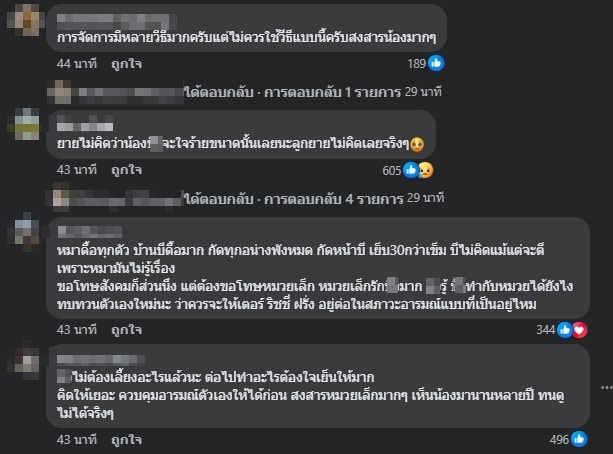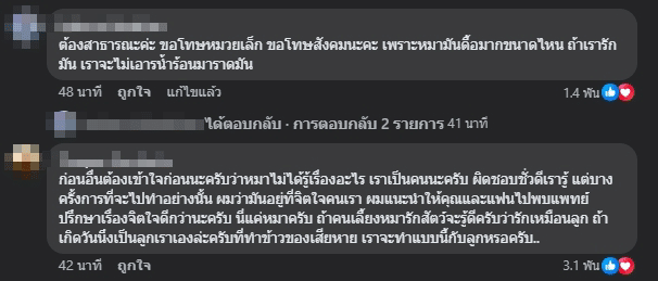 ด้านชาวเน็ตรวมถึงผู้ใช้เฟซบุ๊กที่เป็นเพื่อนกับสาวรายนี้ต่างก็เข้าไปแสดงความคิดเห็นใต้โพสต์ดังกล่าวอย่างมากมาย ถึงการลงโทษที่ไม่เหมาะสมของเธอ อันที่จริงคนที่ควรจะขอโทษมากที่สุดก็คือ “หมวยเล็ก” สุนัขตัวที่เจ้าตัวเทน้ำร้อนใส่มันต่างหาก ทั้งยังมีคนแนะนำให้ไปพบจิตแพทย์เพื่อปรึกษาและรักษาเรื่องสภาพจิตใจ รวมถึงมีคนห่วงหมาอีก 3 ตัวที่เหลือว่าหลังจากนี้จะมีชะตากรรมอย่างไรหากยังต้องอยู่กับครอบครัวนี้