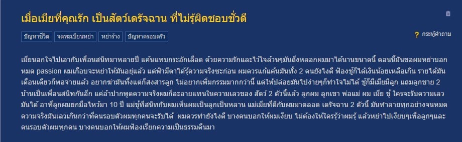 กลายเป็นประเด็นที่พูดถึงบนโลกโซเชียลมีเดียอย่างมาก หลังมีผู้ใช้พันทิป สมาชิกหมายเลข 3147470 ได้ออกมาตั้งคำถามไว้ว่า “เมียนอกใจไปเอากับเพื่อนสนิทมาหลายปี แค้นแทบกระอักเลือด ด้วยความรักและไว้ใจล้วนๆมันถึงหลอกผมมาได้นานขนาดนี้ ตอนนี้มันขอผมหย่าบอกหมด passion ผมเกือบจะหย่าให้มันอยุ่แล้ว แต่ฟ้ามีตาได้รุ้ความจริงซะก่อน ผมควรแก้แค้นมันทั้ง 2 คนยังไงดี ฟ้องชู้ก็ได้เงินน้อยเหลือเกิน รายได้มันเดือนเดียวก็พอจ่ายแล้ว อยากฆ่ามันทิ้งแต่ก็สงสารลูก ไม่อยากเพิ่มกรรมมากกว่านี้ แต่ให้ปล่อยมันไปง่ายๆก็ทำใจไม่ได้ ชู้ก็มีเมียมีลูก แถมลูกชาย 2 บ้านเป็นเพื่อนสนิทกันอีก แค่อ้าปากพูดความจริงผมก็ละอายแทนในความเลวของ สัตว์ 2 ตัวนี้แล้ว ลูกผม ลูกเขา พ่อแม่ ผม เมีย ชู้ ใครจะรับความเลวมันได้ อาที่ลูกผมยกมือไหว้มา 10 ปี แม่ชู้ที่สนิทกับผมเห็นผมเป็นลูกเป็นหลาน แม่เมียที่ดีกับผมมาตลอด เดรัจฉาน 2 ตัวนี้ มันทำลายทุกอย่างจนหมด ความจริงมันเลวเกินกว่าที่คนรอบตัวผมทุกคนจะรับได้ ผมควรทำยังไงดี บางคนบอกให้ผมเงียบ ไม่ต้องให้ใครรุ้ว่าผมรุ้ แล้วหย่าไปเงียบๆเพื่อลูกๆและคนรอบตัวผมทุกคน บางคนบอกให้ผมฟ้องเรียกความเป็นธรรมคืนมา”