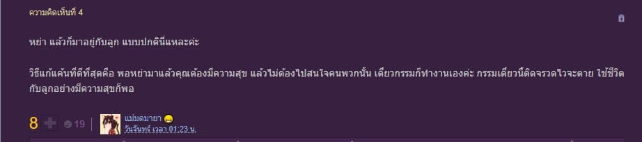 “เข้าใจว่าคุณแค้นมาก แต่อย่าไปแก้แค้นเลยค่ะ เดี่ยวเรื่องจะบานปลาย และส่งผลต่อจิตใจลูกๆด้วย และรวมทุกคนรอบตัวคุณ..ถ้าทุกคนรู้ความจริงคงไม่มีใครรับได้ หย่าเงียบๆ และอยู่กับลูกๆ .ปล่อยสองคนนั้นไป…สักวันเวรกรรมคงตามทัน
