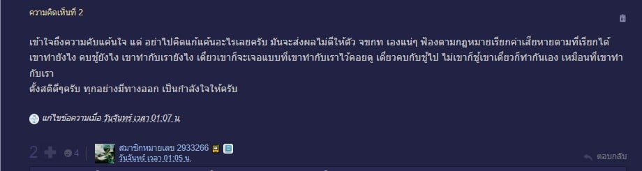 “เข้าใจถึงความคับแค้นใจ แต่ อย่าไปคิดแก้แค้นอะไรเลยครับ มันจะส่งผลไม่ดีให้ตัว จขกท เองแน่ๆ ฟ้องตามกฏหมายเรียกค่าเสียหายตามที่เรียกได้ เขาทำยังไง คบชู้ยังไง เขาทำกับเรายังไง เดี๋ยวเขาก็จะเจอแบบที่เขาทำกับเราไว้คอยดู เดี๋ยวคบกับชู้ไป ไม่เขาก็ชู้เขาเดี๋ยวก็ทำกันเอง เหมือนที่เขาทำกับเรา ตั้งสติดีๆครับ ทุกอย่างมีทางออก เป็นกำลังใจให้ครับ”