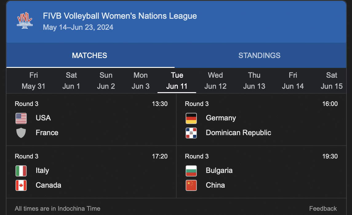 โปรแกรมแข่งขันวอลเลย์บอลหญิง VNL 2024 วันนี้ 11 มิถุนายน 2567 มี 4 คู่บิ๊กแมทช์ สหรัฐอเมริกา พบ ฝรั่งเศส เยอรมนี พบ โดมินิกัน อิตาลี พบ แคนาดา บัลแกเรีย พบ จีน