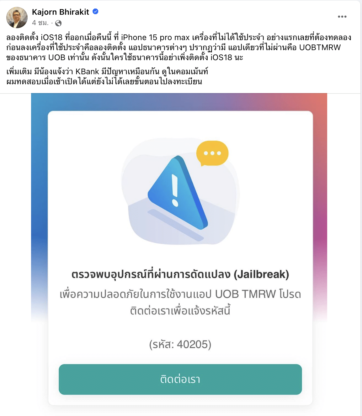 ขณะที่ผู้ใช้เฟซบุ๊ก Kajorn Bhiraikit ได้โพสต์ว่า หลังเขาอัปเดต iOS18 บน ไอโฟน 15 pro max ก็ไม่สามารถใช้งานแอปพลิเคชั่น UOB TMRW ได้
