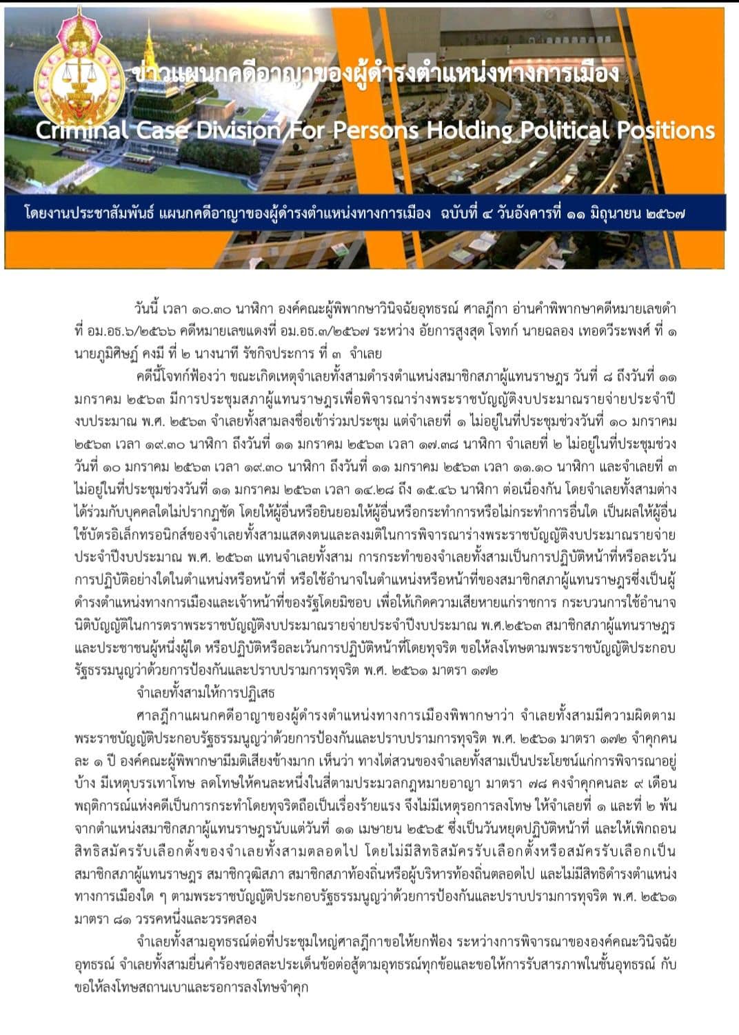 ศาลฎีกาแผนกคดีอาญาของผู้ดำรงตำแหน่งทางการเมืองพิจารณาแล้ว เห็นว่าการกระทำของจำเลยทั้งสามเป็นการทุจริต ถือเป็นเรื่องร้ายแรงที่ส่งผลกระทบต่อการปกครอง จึงพิพากษาจำคุกคนละ 1 ปี ลดโทษเหลือคนละ 9 เดือน โดยไม่รอลงอาญา พร้อมทั้งให้จำเลยที่ 1 และ 2 พ้นจากตำแหน่ง ส.ส. และเพิกถอนสิทธิในการสมัครรับเลือกตั้งตลอดชีวิต