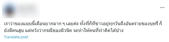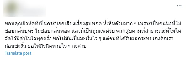 “ขอบคุณชาว X นะคะที่เห็นด้วยกับสิ่งที่หนูพูด ถึงแม้ว่าสตอรี่หนูจะโดนสั่งลบไปแล้วก็ตาม ขอบคุณทุกคนที่อวยพรให้หายดีนะคะ ขอโทษด้วยที่ทำให้เป็นห่วง จริง ๆ หนูพูดเรื่องบุหรี่ไฟฟ้าก็คงมีฝั่งที่ไม่เห็นด้วย คงจะโดนว่าแหละ ไม่เป็นไร วันหลังหนูคิดว่าไม่พูดก็น่าจะดีกว่า”