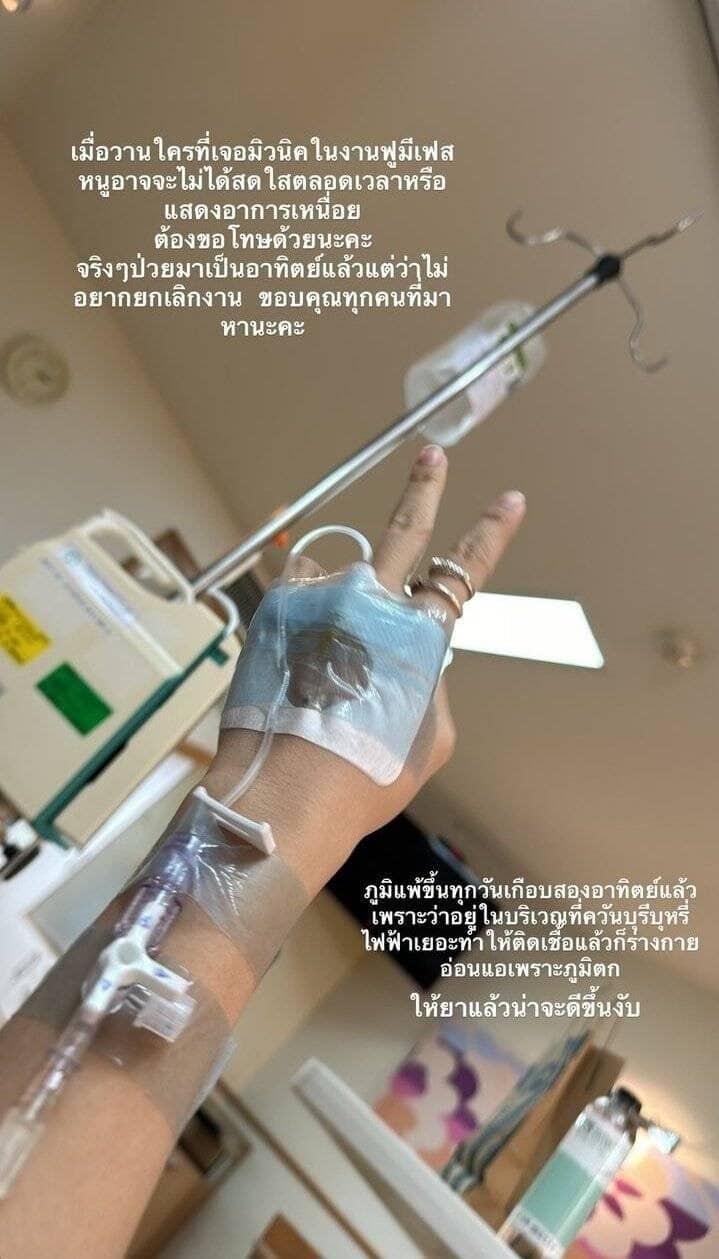 “เมื่อวานใครที่เจอมิวนิคในงานฟูมีเฟส หนูอาจจะไม่ได้สดใสตลอดเวลา หรือแสดงอาการเหนื่อย ต้องขอโทษด้วยนะคะ จริง ๆ ป่วยมาเป็นอาทิตย์แล้วแต่ว่าไม่อยากยกเลิกงาน ขอบคุณทุกคนที่มาหานะคะ ภูมิแพ้ขึ้นทุกวันเกือบสองอาทิตย์แล้ว เพราะว่าอยู่ในบริเวณที่ควันบุหรี่ไฟฟ้าเยอะ ทำให้ติดเชื้อ แล้วก็ร่างกายอ่อนแอเพราะภูมิตก ให้ยาแล้วน่าจะดีขึ้นงับ”