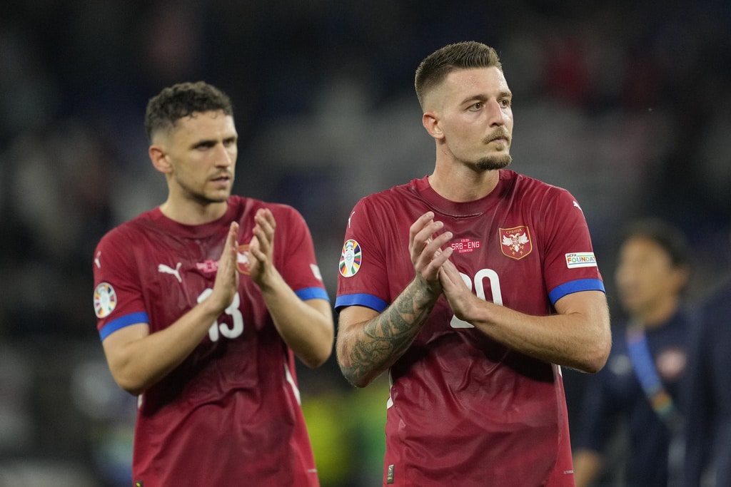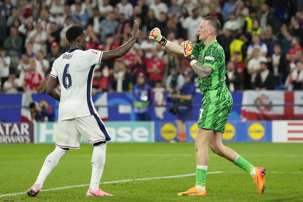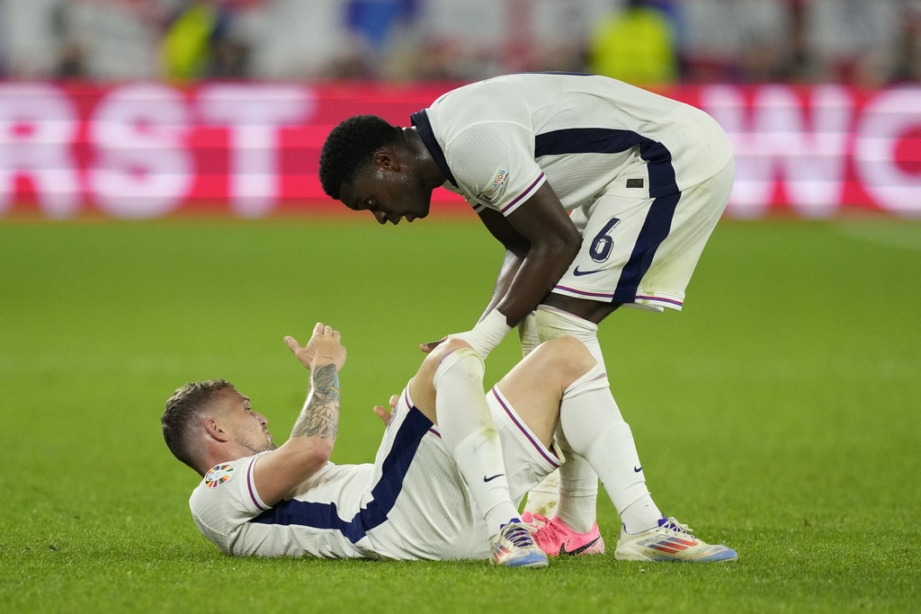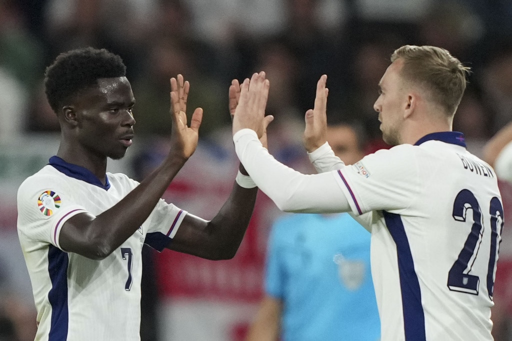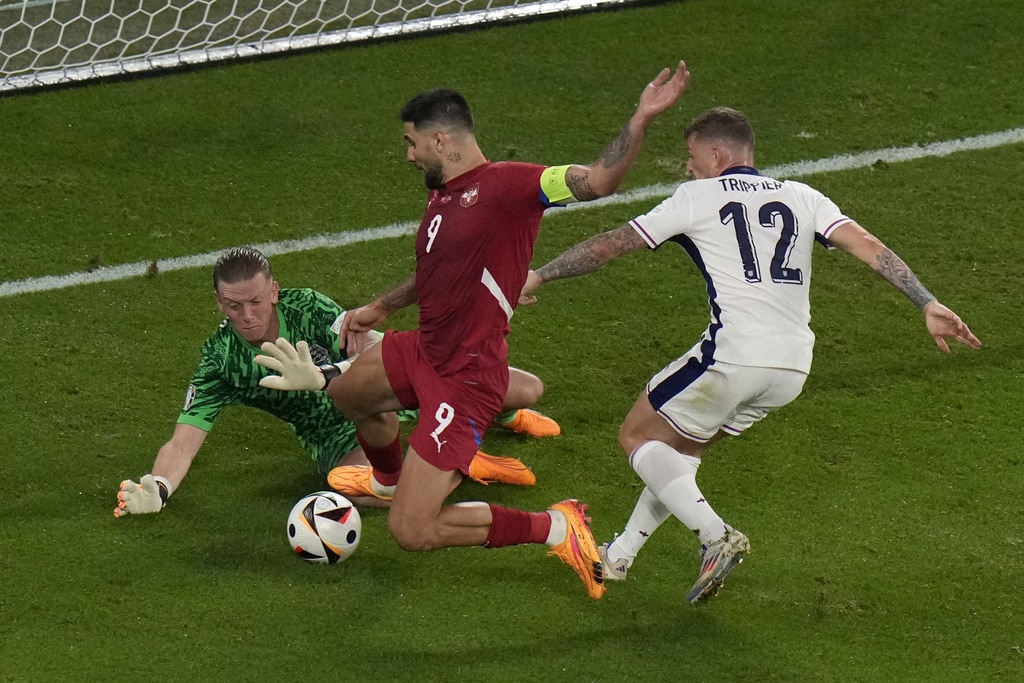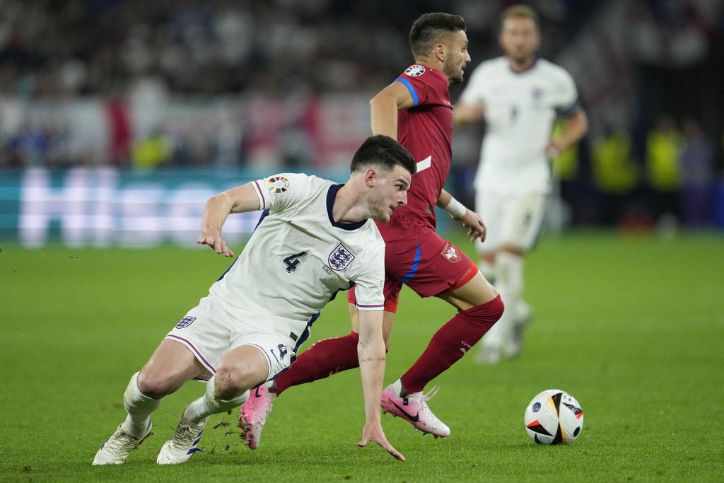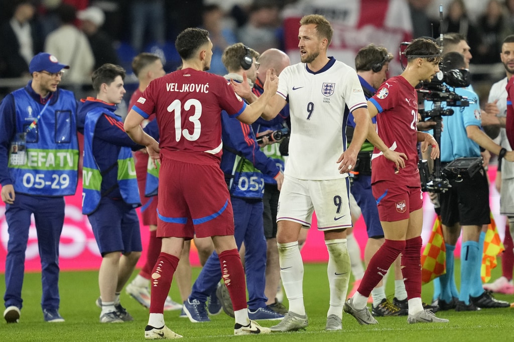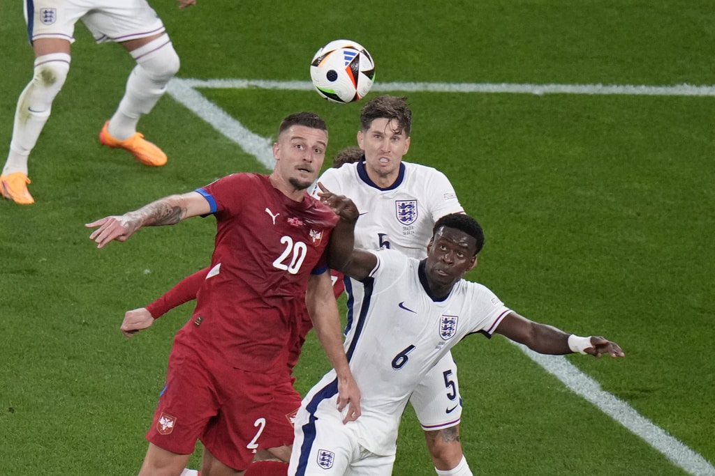 England’s Declan Rice, left, challenges for the ball with Serbia’s Dusan Tadic during a Group C match between Serbia and England at the Euro 2024 soccer tournament in Gelsenkirchen, Germany, Sunday, June 16, 2024. (AP Photo/Andreea Alexandru)England’s Harry Kane, front, duels for the ball with Serbia’s Nikola Milenkovic during a Group C match between Serbia and England at the Euro 2024 soccer tournament in Gelsenkirchen, Germany, Sunday, June 16, 2024. (AP Photo/Martin Meissner)England’s Jude Bellingham celebrates after scoring the opening goal during a Group C match between Serbia and England at the Euro 2024 soccer tournament in Gelsenkirchen, Germany, Sunday, June 16, 2024. (AP Photo/Martin Meissner)Serbia’s Sergej Milinkovic-Savic, left, England’s Marc Guehi, right, and England’s John Stones jump for the ball during a Group C match between Serbia and England at the Euro 2024 soccer tournament in Gelsenkirchen, Germany, Sunday, June 16, 2024. (AP Photo/Alessandra Tarantino)England’s goalkeeper Jordan Pickford, left, makes a save in front Serbia’s Aleksandar Mitrovic, center, during a Group C match between Serbia and England at the Euro 2024 soccer tournament in Gelsenkirchen, Germany, Sunday, June 16, 2024. (AP Photo/Alessandra Tarantino)England’s Marc Guehi helps England’s Kieran Trippier get up after a foul during a Group C match between Serbia and England at the Euro 2024 soccer tournament in Gelsenkirchen, Germany, Sunday, June 16, 2024. (AP Photo/Andreea Alexandru)Serbia’s Sergej Milinkovic-Savic and Milos Veljkovic applaud fans during a Group C match between Serbia and England at the Euro 2024 soccer tournament in Gelsenkirchen, Germany, Sunday, June 16, 2024. (AP Photo/Andreea Alexandru)England’s Harry Kane shakes hands with Serbia’s Milos Veljkovic at the end of a Group C match between Serbia and England at the Euro 2024 soccer tournament in Gelsenkirchen, Germany, Sunday, June 16, 2024. (AP Photo/Andreea Alexandru)England’s Marc Guehi touches hands with England’s goalkeeper Jordan Pickford during a Group C match between Serbia and England at the Euro 2024 soccer tournament in Gelsenkirchen, Germany, Sunday, June 16, 2024. (AP Photo/Andreea Alexandru)England’s Bukayo Saka, left, is substituted for England’s Jarrod Bowen during a Group C match between Serbia and England at the Euro 2024 soccer tournament in Gelsenkirchen, Germany, Sunday, June 16, 2024. (AP Photo/Martin Meissner)