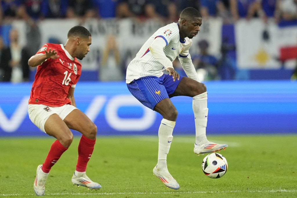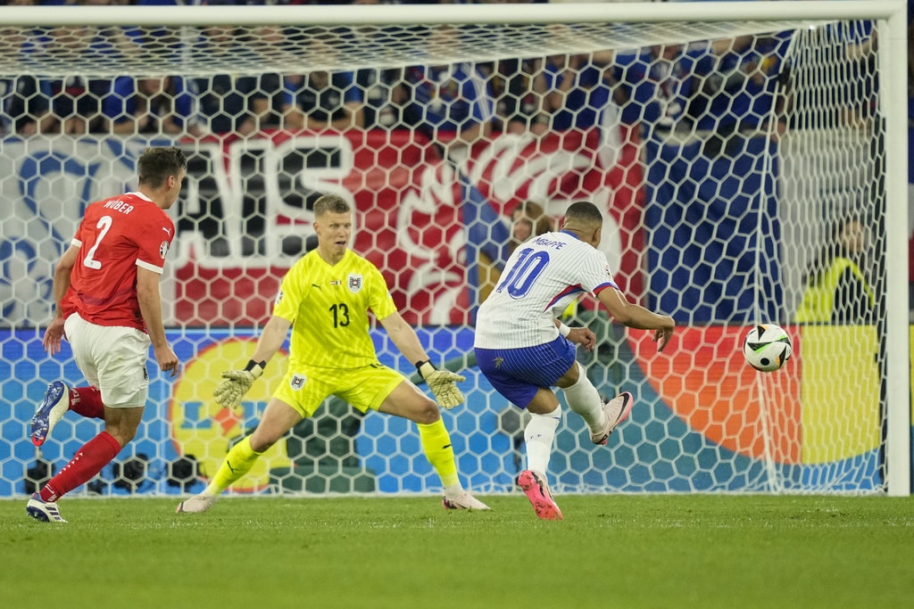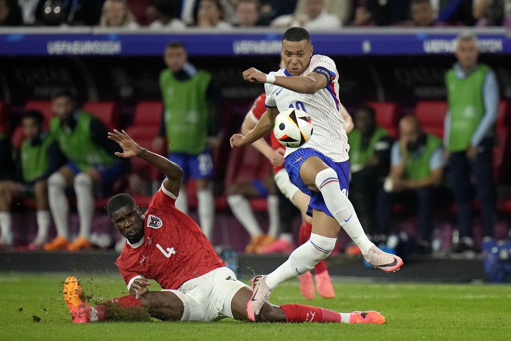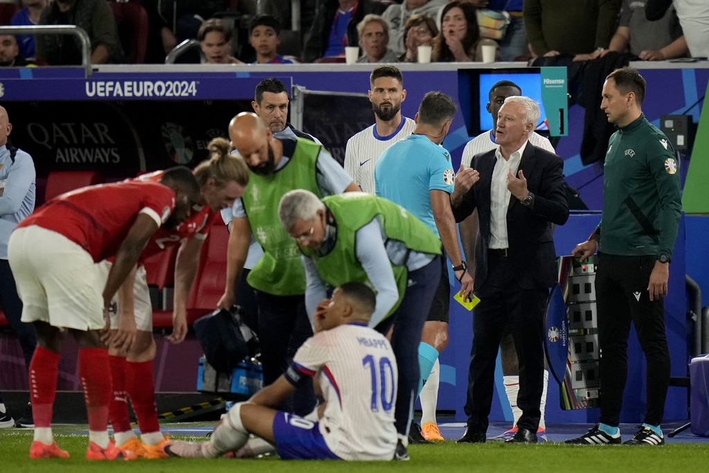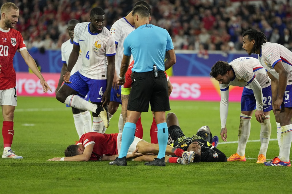 Ousmane Dembele of France controls the ball next to Austria’s Philipp Mwene during a Group D match between Austria and France at the Euro 2024 soccer tournament in Duesseldorf, Germany, Monday, June 17, 2024. (AP Photo/Andreea Alexandru)Austria’s Kevin Danso, left, challenges for the ball with Kylian Mbappe of France during a Group D match between Austria and France at the Euro 2024 soccer tournament in Duesseldorf, Germany, Monday, June 17, 2024. (AP Photo/Alessandra Tarantino)France head coach Didier Deschamps, right, talks to referee Jesus Gil Manzano of Spain during a Group D match between Austria and France at the Euro 2024 soccer tournament in Duesseldorf, Germany, Monday, June 17, 2024. (AP Photo/Alessandra Tarantino)Austria’s Christoph Baumgartner and France goalkeeper Mike Maignan lie on the pitch after colliding during a Group D match between Austria and France at the Euro 2024 soccer tournament in Duesseldorf, Germany, Monday, June 17, 2024. (AP Photo/Andreea Alexandru)Kylian Mbappe of France receives a treatment after suffering an injury during a Group D match between Austria and France at the Euro 2024 soccer tournament in Duesseldorf, Germany, Monday, June 17, 2024. (AP Photo/Alessandra Tarantino)Theo Hernandez of France challenges for the ball with Austria’s Patrick Wimmer during a Group D match between Austria and France at the Euro 2024 soccer tournament in Duesseldorf, Germany, Monday, June 17, 2024. (AP Photo/Andreea Alexandru)William Saliba of France, right, challenges Austria’s Patrick Wimmer, left, during a Group D match between Austria and France at the Euro 2024 soccer tournament in Duesseldorf, Germany, Monday, June 17, 2024. (AP Photo/Hassan Ammar)Austria’s Patrick Wimmer, left, challenges Theo Hernandez of France, right, during a Group D match between Austria and France at the Euro 2024 soccer tournament in Duesseldorf, Germany, Monday, June 17, 2024. (AP Photo/Hassan Ammar)Austria’s Patrick Wimmer challenges for the ball with N’Golo Kante of France during a Group D match between Austria and France at the Euro 2024 soccer tournament in Duesseldorf, Germany, Monday, June 17, 2024. (AP Photo/Andreea Alexandru)Kylian Mbappe of France fails to score during a Group D match between Austria and France at the Euro 2024 soccer tournament in Duesseldorf, Germany, Monday, June 17, 2024. (AP Photo/Andreea Alexandru)