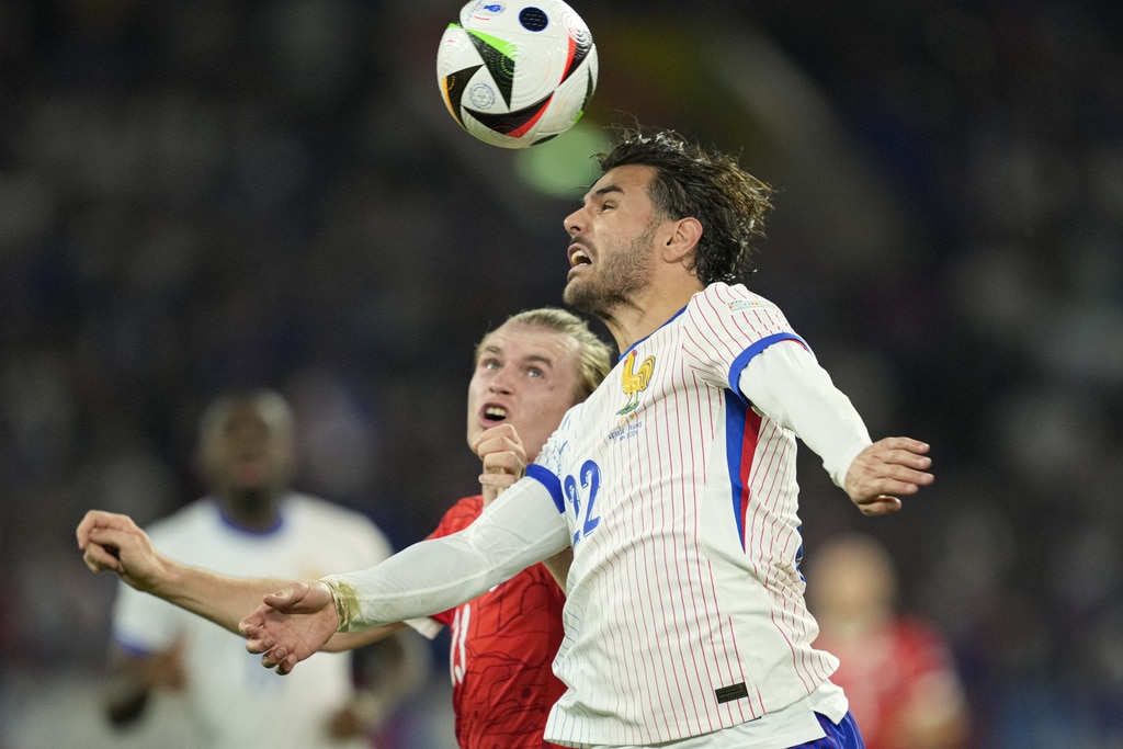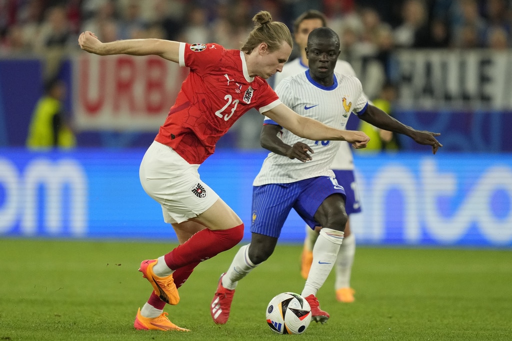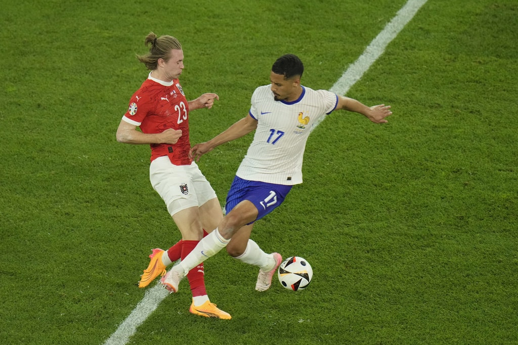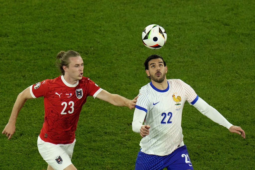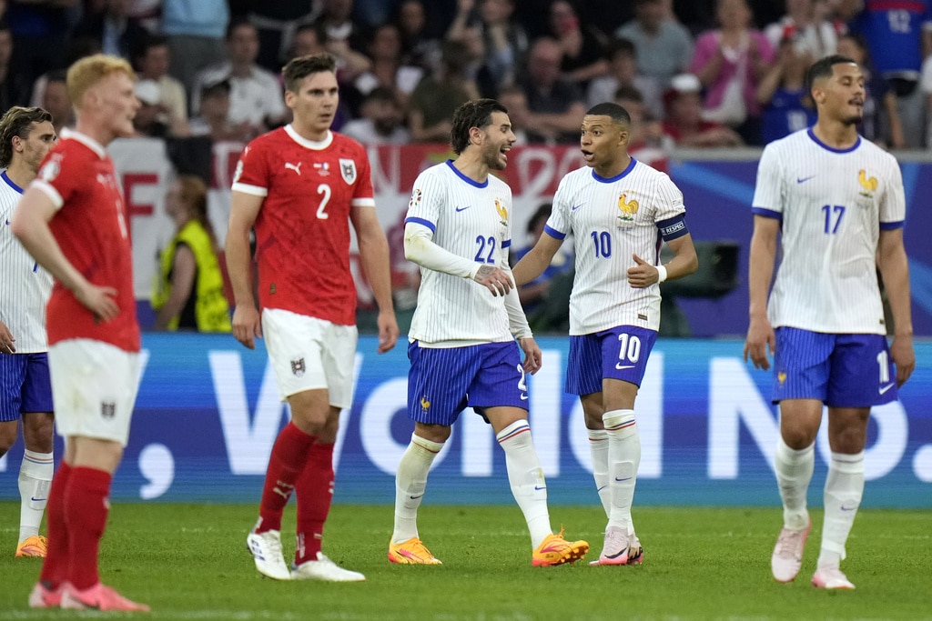 Ousmane Dembele of France controls the ball next to Austria’s Philipp Mwene during a Group D match between Austria and France at the Euro 2024 soccer tournament in Duesseldorf, Germany, Monday, June 17, 2024. (AP Photo/Andreea Alexandru)Austria’s Kevin Danso, left, challenges for the ball with Kylian Mbappe of France during a Group D match between Austria and France at the Euro 2024 soccer tournament in Duesseldorf, Germany, Monday, June 17, 2024. (AP Photo/Alessandra Tarantino)France head coach Didier Deschamps, right, talks to referee Jesus Gil Manzano of Spain during a Group D match between Austria and France at the Euro 2024 soccer tournament in Duesseldorf, Germany, Monday, June 17, 2024. (AP Photo/Alessandra Tarantino)Austria’s Christoph Baumgartner and France goalkeeper Mike Maignan lie on the pitch after colliding during a Group D match between Austria and France at the Euro 2024 soccer tournament in Duesseldorf, Germany, Monday, June 17, 2024. (AP Photo/Andreea Alexandru)Kylian Mbappe of France receives a treatment after suffering an injury during a Group D match between Austria and France at the Euro 2024 soccer tournament in Duesseldorf, Germany, Monday, June 17, 2024. (AP Photo/Alessandra Tarantino)Theo Hernandez of France challenges for the ball with Austria’s Patrick Wimmer during a Group D match between Austria and France at the Euro 2024 soccer tournament in Duesseldorf, Germany, Monday, June 17, 2024. (AP Photo/Andreea Alexandru)William Saliba of France, right, challenges Austria’s Patrick Wimmer, left, during a Group D match between Austria and France at the Euro 2024 soccer tournament in Duesseldorf, Germany, Monday, June 17, 2024. (AP Photo/Hassan Ammar)Austria’s Patrick Wimmer, left, challenges Theo Hernandez of France, right, during a Group D match between Austria and France at the Euro 2024 soccer tournament in Duesseldorf, Germany, Monday, June 17, 2024. (AP Photo/Hassan Ammar)Austria’s Patrick Wimmer challenges for the ball with N’Golo Kante of France during a Group D match between Austria and France at the Euro 2024 soccer tournament in Duesseldorf, Germany, Monday, June 17, 2024. (AP Photo/Andreea Alexandru)Kylian Mbappe of France fails to score during a Group D match between Austria and France at the Euro 2024 soccer tournament in Duesseldorf, Germany, Monday, June 17, 2024. (AP Photo/Andreea Alexandru)