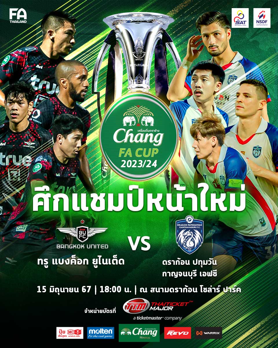 15 มิถุนายน 2567 เวลา 18.00 น. ฟุตบอล ช้าง เอฟเอ คัพ 2023/24 รอบชิงชนะเลิศ ทรู แบงค็อก พบ ดราก้อน ปทุมวัน กาญจนบุรี เอฟซี The Thaiger พาวิเคราะห์ก่อนเกม พร้อมคาดการณ์ 11 ตัวจริง และรับลิงก์ ดูบอลสด ได้ที่นี่