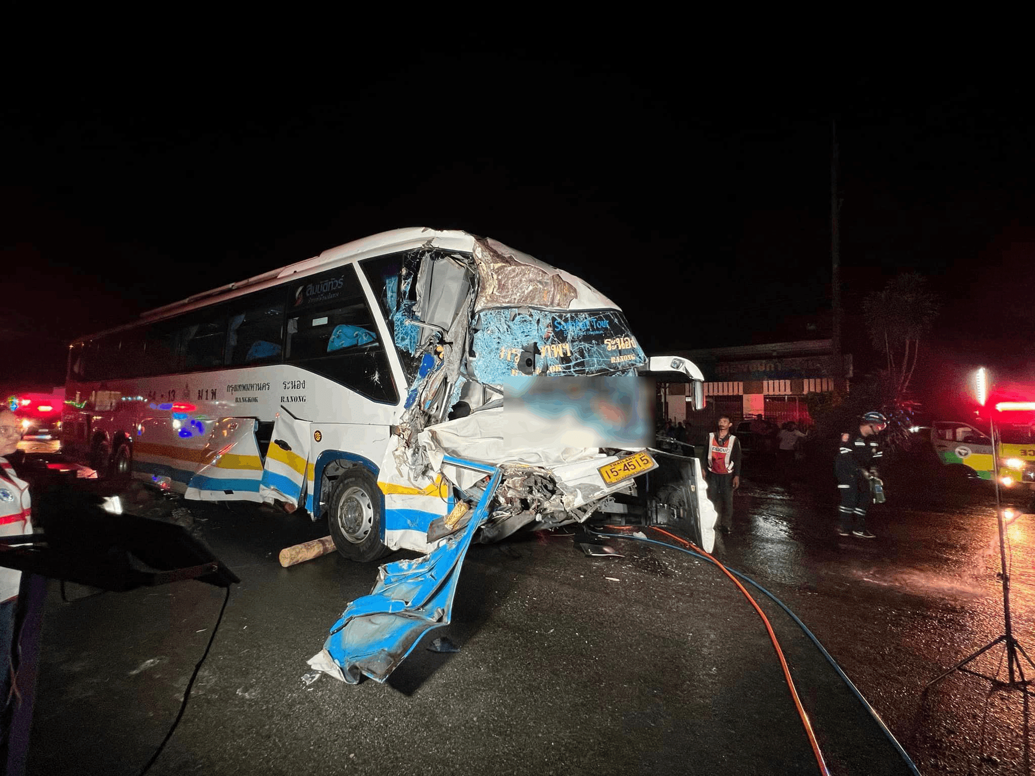 เมื่อถึงจุดเกิดเหตุพบรถทัวร์โดยสารร่วม บขส.ประจำทาง กรุงเทพ-ระนอง กรุงเทพมหานคร ติดสติ๊กเกอร์ข้างว่า รถสมบัติทัวร์ จอดอยู่ช่องทางขวา สภาพด้านหน้าพังเสียหายยับ หลังจากที่ไปชนกับท้ายรถบรรทุกท่อนไม้ยางพารา ที่กำลังจะหันหัวกลับรถ ทำให้เศษชิ้นส่วนรถและท่อนไม้ยางพาราตกเกลื่อนถนน