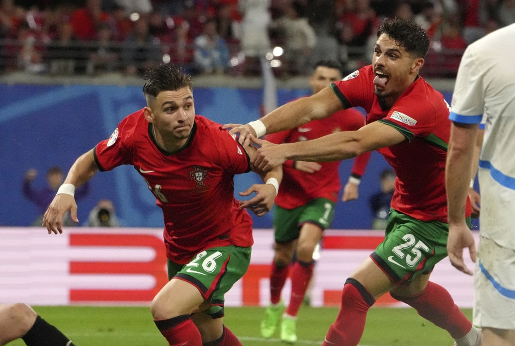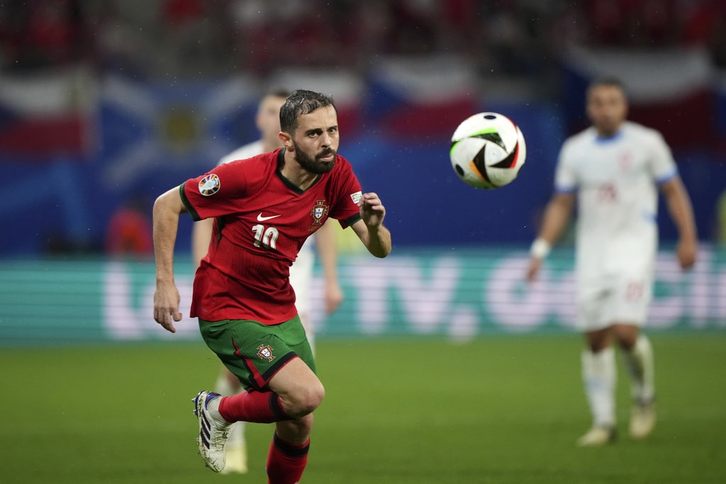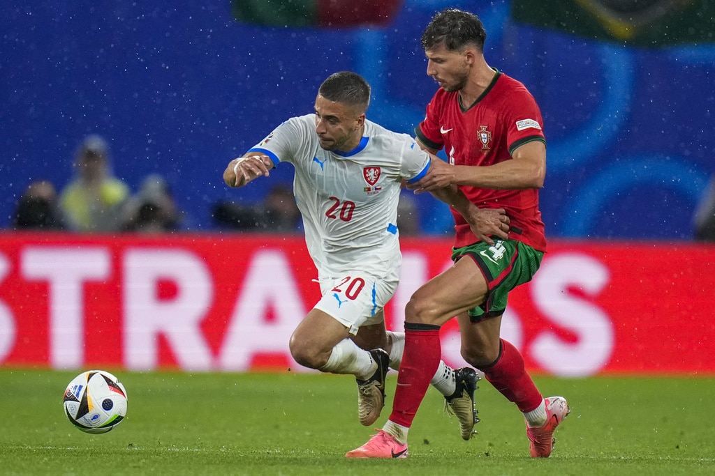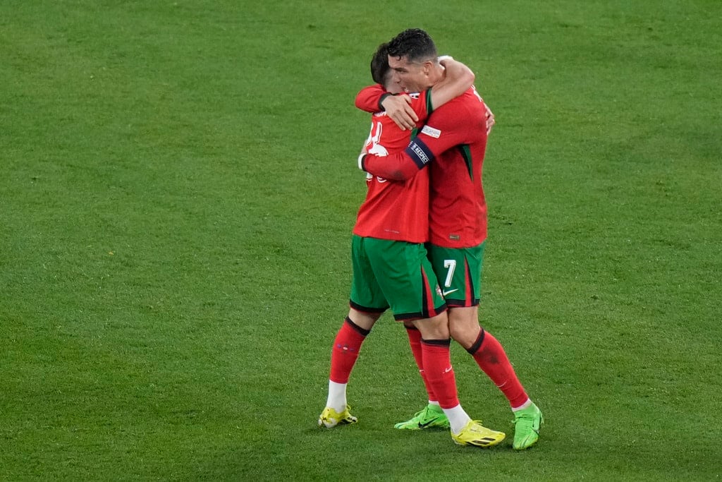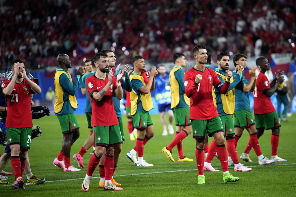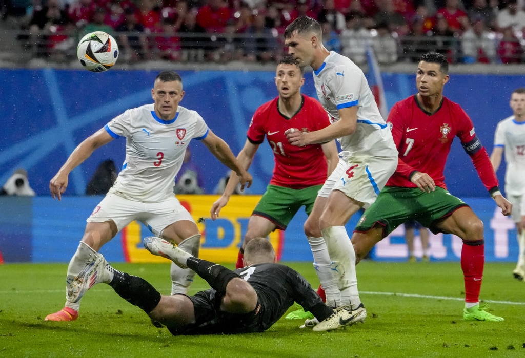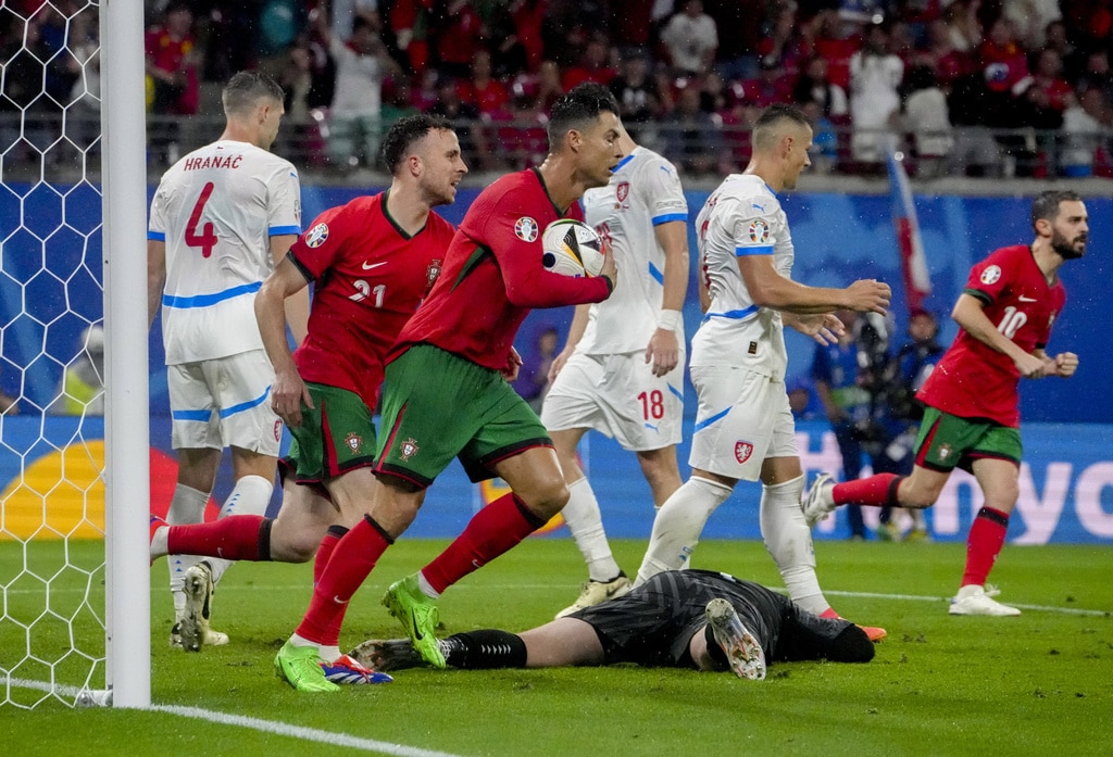 Portugal’s Cristiano Ronaldo gestures during a Group F match between Portugal and Czech Republic at the Euro 2024 soccer tournament in Leipzig, Germany, Tuesday, June 18, 2024. (Robert Michael/dpa via AP)Portugal’s Bernardo Silva in action during a Group F match between Portugal and Czech Republic at the Euro 2024 soccer tournament in Leipzig, Germany, Tuesday, June 18, 2024. (AP Photo/Ebrahim Noroozi)Portugal’s Francisco Conceicao, left, celebrates his side’s second goal during a Group F match between Portugal and Czech Republic at the Euro 2024 soccer tournament in Leipzig, Germany, Tuesday, June 18, 2024. (AP Photo/Sunday Alamba)Portugal’s Cristiano Ronaldo reacts after a Group F match between Portugal and the Czech Republic at the Euro 2024 soccer tournament in Leipzig, Germany, Tuesday, June 18, 2024. (AP Photo/Sunday Alamba)Portugal’s Cristiano Ronaldo with teammates celebrates at the end of Group F match between Portugal and Czech Republic at the Euro 2024 soccer tournament in Leipzig, Germany, Tuesday, June 18, 2024. (AP Photo/Ebrahim Noroozi)Portugal’s Cristiano Ronaldo (7) and Francisco Conceicao celebrate after a Group F match between Portugal and Czech Republic at the Euro 2024 soccer tournament in Leipzig, Germany, Tuesday, June 18, 2024. (AP Photo/Sergei Grits)Portugal’s Cristiano Ronaldo, right, watches Czech Republic’s Robin Hranac second from right, score an own goal to make it 1-1 during a Group F match between Portugal and the Czech Republic at the Euro 2024 soccer tournament in Leipzig, Germany, Tuesday, June 18, 2024. (AP Photo/Sunday Alamba)Portugal’s Cristiano Ronaldo runs away with the ball after his side’s equalising goal during a Group F match between Portugal and the Czech Republic at the Euro 2024 soccer tournament in Leipzig, Germany, Tuesday, June 18, 2024. (AP Photo/Sunday Alamba)Czech Republic’s Ondrej Lingr, left, duels for the ball with Portugal’s Ruben Dias during a Group F match between Portugal and Czech Republic at the Euro 2024 soccer tournament in Leipzig, Germany, Tuesday, June 18, 2024. (AP Photo/Petr Josek)Portugal players celebrate after Czech Republic’s Robin Hranac scores an own goal past his goalkeeper during a Group F match between Portugal and Czech Republic at the Euro 2024 soccer tournament in Leipzig, Germany, Tuesday, June 18, 2024. (AP Photo/Petr Josek)