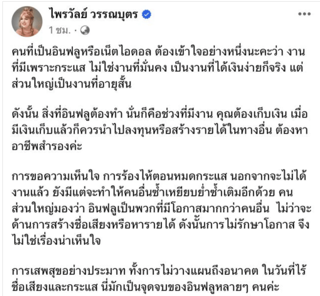 ด้านแพรรี่ ไพรวัลย์ ก็ได้แชร์ข่าวพี่พรร่ำไห้ ไม่มีงาน ผ่านเฟซบุ๊ก ไพรวัลย์ วรรณบุตร ให้ความรู้เรื่องสัจธรรมของงานอินฟลูเอนเซอร์ไว้อย่างน่าสนใจว่า
