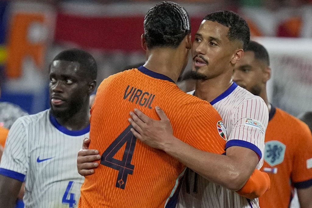 William Saliba of France, right, hugs Virgil van Dijk of the Netherlands at the end of a Group D match between the Netherlands and France at the Euro 2024 soccer tournament in Leipzig, Germany, Friday, June 21, 2024. (AP Photo/Ariel Schalit)
