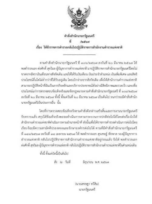 อย่างไรก็ตามมีเอกสารจากสำนักนายกรัฐมนตรี ระบุเรื่องให้ข้าราชการตำรวจกลับไปปฏิบัติราชการสำนักงานตำรวจแห่งชาติ โดยระบุว่า