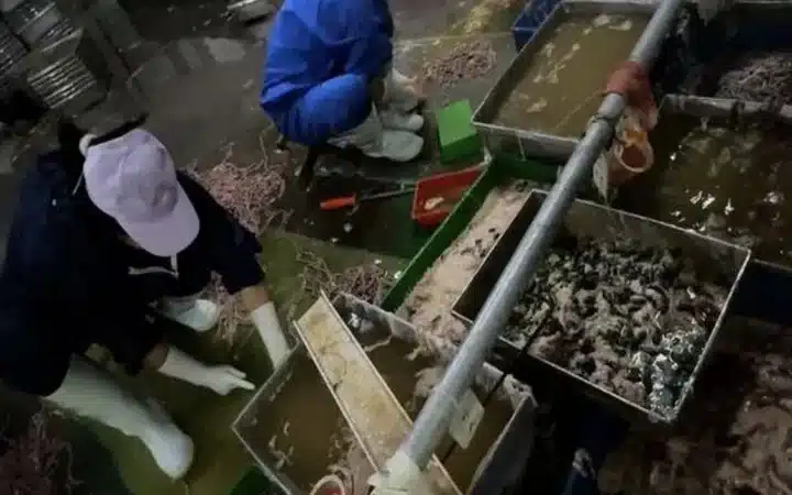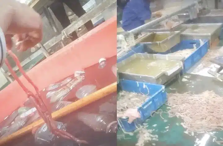 วันนี้ 20 มิถุนายน 2567 โซเชียลจีนเดือดอีกครั้ง หลังมีภาพหลุดสุดสยองจากโรงงานแปรรูปเครื่องในสัตว์ แสดงให้เห็นกระบวนการผลิตที่สกปรกไม่ถูกสุขลักษณะ ทั้งการเหยียบไส้ห่านด้วยรองเท้าบูทพลาสติกเพื่อไล่ขี้ การแช่ไส้ในน้ำเน่าเพื่อให้ดูสดใหม่ และที่แย่ไปกว่านั้นคือมีคนงานปัสสาวะลงในท่อระบายน้ำเสียของโรงงาน