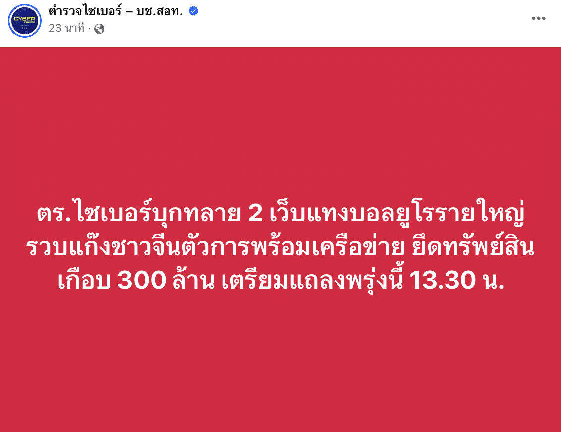 ตำรวจไซเบอร์ภายใต้การนำของ บช.สอท. ได้เปิดเผยว่า ได้ทลายเว็บแทงบอลออนไลน์ขนาดใหญ่จำนวน 2 เว็บ โดยสามารถจับกุมแก๊งชาวจีนที่เป็นตัวการสำคัญของเครือข่ายนี้ได้ พร้อมทั้งยึดทรัพย์สินรวมมูลค่าเกือบ 300 ล้านบาท จะแถลงข่าวการจับกุมในวันพรุ่งนี้ (21 มิถุนายน) เวลา 13.30 น.