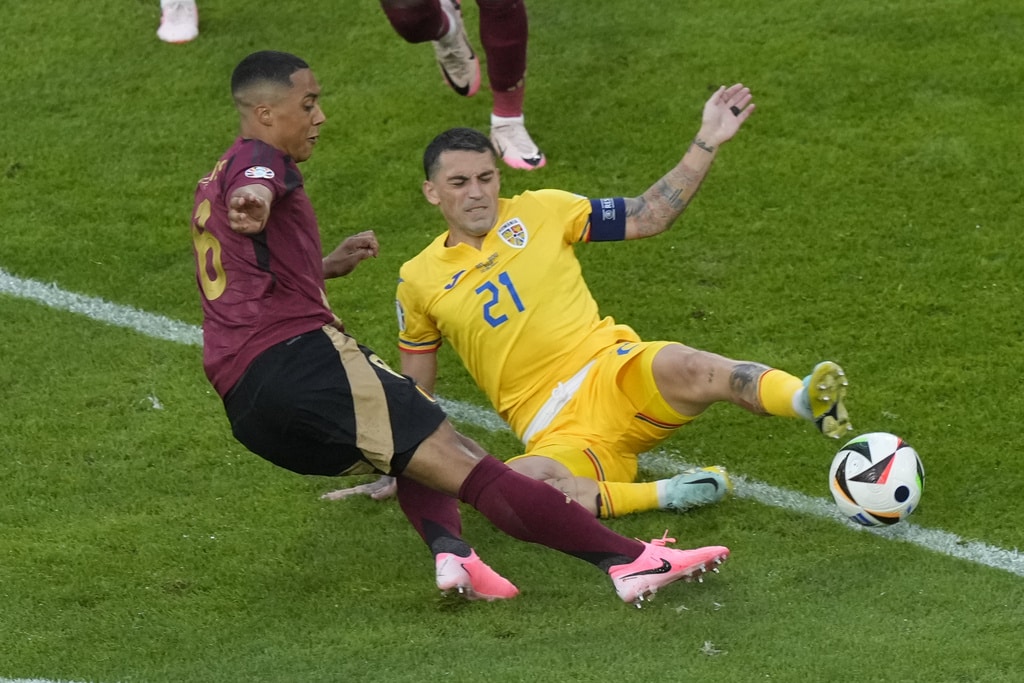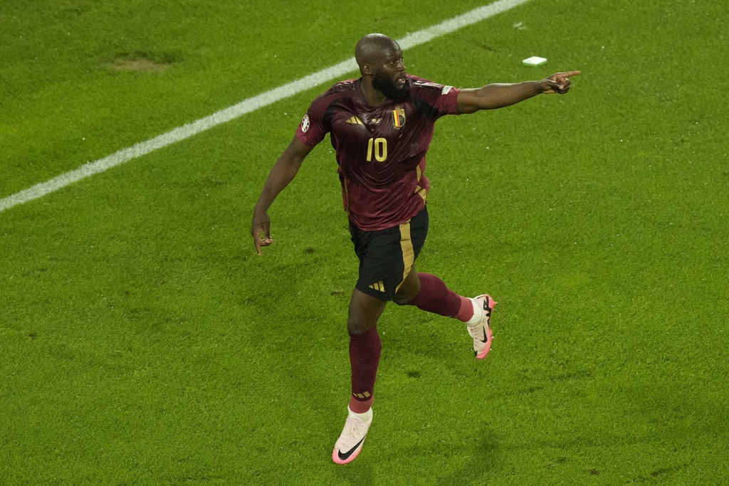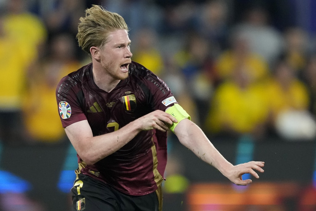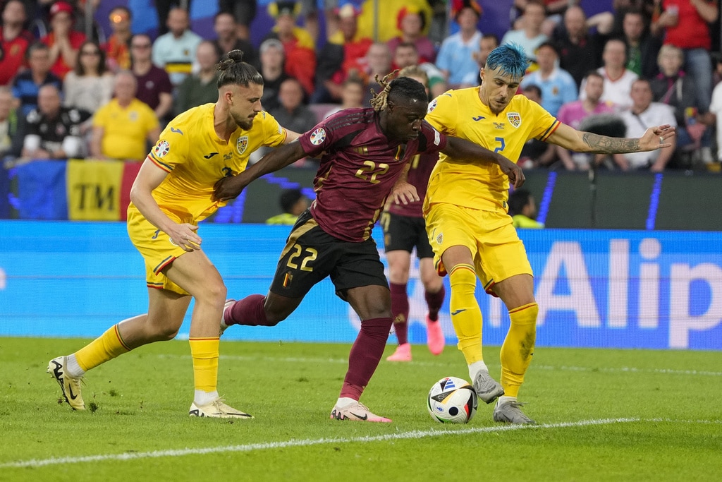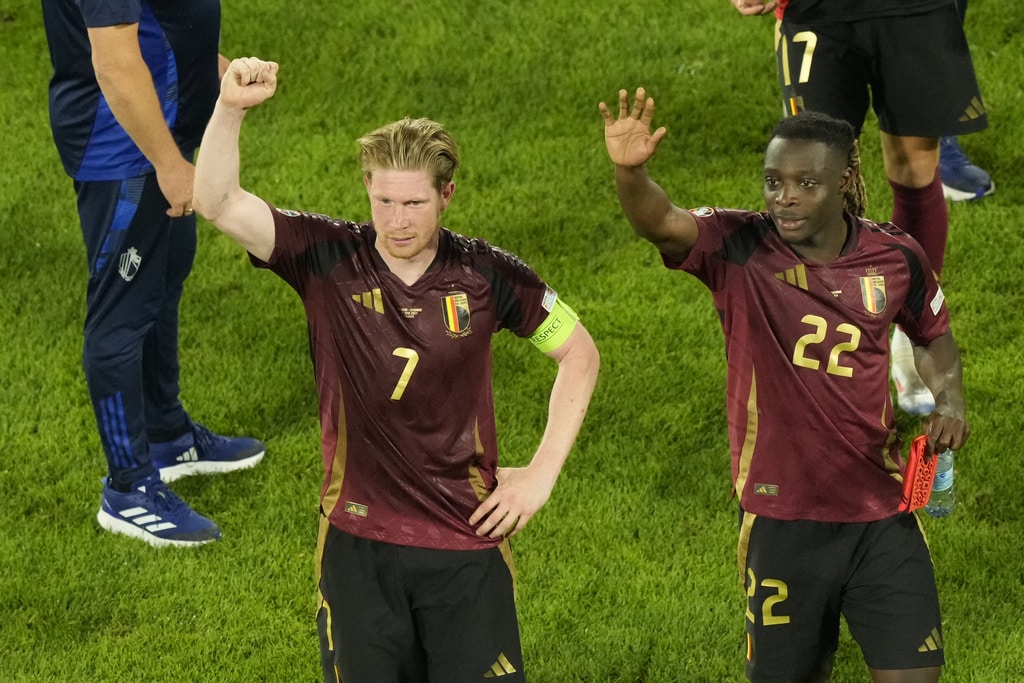 Belgium’s Youri Tielemans, left, scores his side’s opening goal past Romania’s Nicolae Stanciu during a Group E match between Belgium and Romania at the Euro 2024 soccer tournament in Cologne, Germany, Saturday, June 22, 2024. (AP Photo/Frank Augstein)Belgium’s Kevin De Bruyne celebrates after scoring his side’s second goal during a Group E match between Belgium and Romania at the Euro 2024 soccer tournament in Cologne, Germany, Saturday, June 22, 2024. (AP Photo/Martin Meissner)Romania’s Denis Alibec, right, attempts a shot on goal challenged by Belgium’s Wout Faes during a Group E match between Belgium and Romania at the Euro 2024 soccer tournament in Cologne, Germany, Saturday, June 22, 2024. (AP Photo/Andreea Alexandru)Belgium’s Kevin De Bruyne, left, celebrates with Belgium’s Yannick Carrasco after scoring his side’s second goal during a Group E match between Belgium and Romania at the Euro 2024 soccer tournament in Cologne, Germany, Saturday, June 22, 2024. (AP Photo/Martin Meissner)Belgium’s Kevin De Bruyne celebrates after scoring his side’s second goal with teammates during a Group E match between Belgium and Romania at the Euro 2024 soccer tournament in Cologne, Germany, Saturday, June 22, 2024. (AP Photo/Frank Augstein)Belgium’s Kevin De Bruyne celebrates after scoring his side’s second goal during a Group E match between Belgium and Romania at the Euro 2024 soccer tournament in Cologne, Germany, Saturday, June 22, 2024. (AP Photo/Martin Meissner)Belgium’s Romelu Lukaku celebrates after scoring a goal that was then disallowed for offside during a Group E match between Belgium and Romania at the Euro 2024 soccer tournament in Cologne, Germany, Saturday, June 22, 2024. (AP Photo/Frank Augstein)Romania’s Radu Dragusin, left, and Andrei Ratiu, right, challenge Belgium’s Jeremy Doku during a Group E match between Belgium and Romania at the Euro 2024 soccer tournament in Cologne, Germany, Saturday, June 22, 2024. (AP Photo/Andreea Alexandru)Belgium’s soccer team players Kevin De Bruyne and Jeremy Dokuc elebrate at the end of Group E match between Belgium and Romania at the Euro 2024 soccer tournament in Cologne, Germany, Saturday, June 22, 2024. (AP Photo/Frank Augstein)