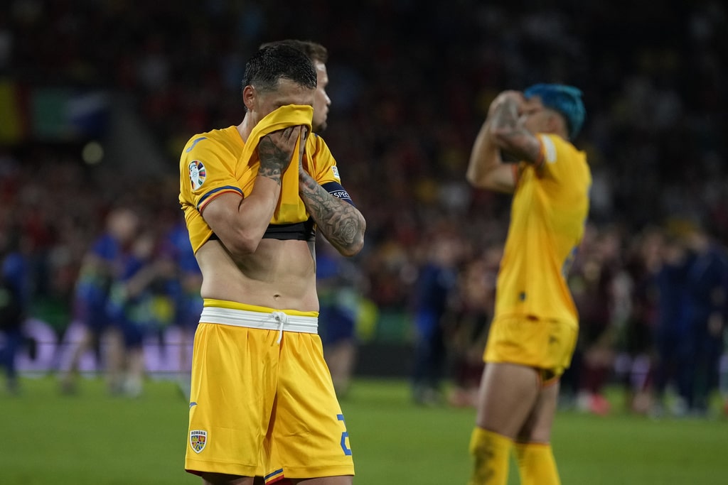 Romania’s Nicolae Stanciu reacts at the end of a Group E match between Belgium and Romania at the Euro 2024 soccer tournament in Cologne, Germany, Saturday, June 22, 2024. Belgium won 2-0. (AP Photo/Alessandra Tarantino)