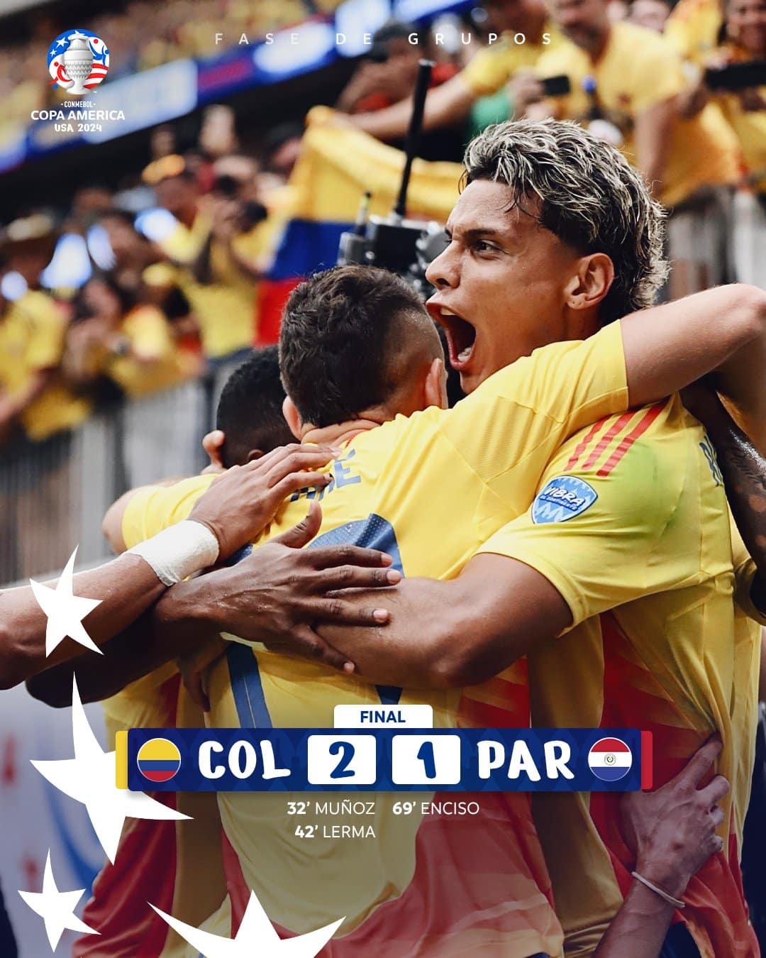 ผลการแข่งขันปรากฏว่า โคลอมเบีย ออกสตาร์ทนัดแรกศึกโกปา อเมริกา 2024 ได้สวยงาม เกมนี้เบียดชนะ ปารากวัย ได้ 2-1 ก่อนมีโปรแกรทนัดที่สอง กลุ่ม ดี จะพบ คอสตาริกา วันเสาร์ที่ 29 มิถุนายนนี้