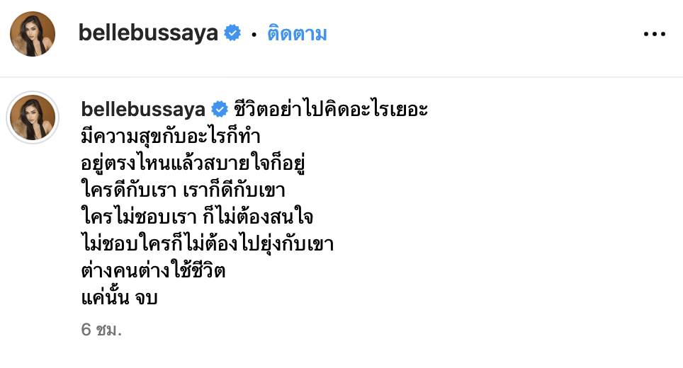 ความเคลื่อนไหวล่าสุด สาวสวยสุดแซ่บ “เบล บุษยา” ทำไอจี @bellebussaya ร้อนฉ่าอีกแล้ว กับแคปชั่นชวนคิดตาม “ชีวิตอย่าไปคิดอะไรเยอะ มีความสุขกับอะไรก็ทำ อยู่ตรงไหนแล้วสบายใจก็อยู่ ใครดีกับเรา เราก็ดีกับเขา ใครไม่ชอบเรา ก็ไม่ต้องสนใจ ไม่ชอบใครก็ไม่ต้องไปยุ่งกับเขา ต่างคนต่างใช้ชีวิต แค่นั้น จบ” พร้อมรูปภาพสุดเผ็ดใส่เกาะอกสีขาวคลุมทับด้วยแจ็คเกคแขนกุดสีดำสุดเท่ นั่งบนรถหรู