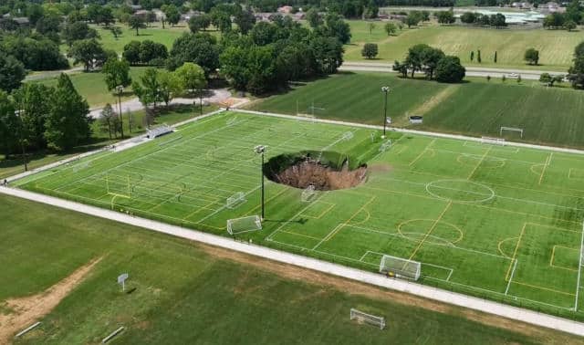 ระทึก สนามฟุตบอลสหรัฐฯ ยุบตัวเป็นหลุมกว้าง 30 เมตร และลึกเกือบ 10 เมตร สาเหตุมาจากเหมืองใต้ดินยุบตัว โชคดีไร้คนเจ็บ