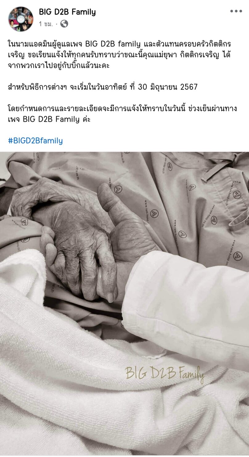 คุณแม่ยุพา กิตติกรเจริญ มารดาของ บิ๊ก ดีทูบี (D2B) เสียชีวิตแล้ว แฟนคลับส่งกำลังใจคุณพ่ออุดม