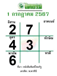 - เลขตาราง หวยไทยรัฐ : 2 – 7 – 4 – 3 – 6