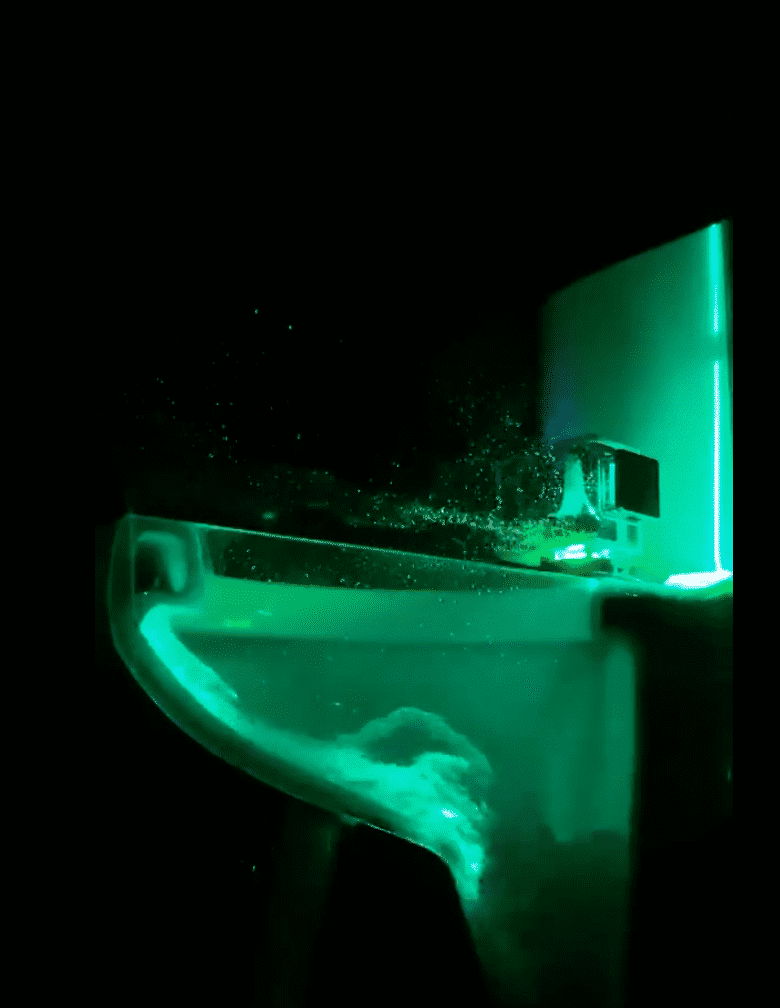 ในการทดลองครั้งที่สอง เขาเทน้ำยาเรืองแสงลงในแทงก์น้ำของโถส้วม รอให้น้ำยาผสมเข้ากัน แล้วกดชักโครกอีกครั้ง จากนั้นใช้แสงแบล็กไลท์ส่องดู จะเห็นได้ว่า “ละอองจากของเสีย” ฟุ้งกระจายไปได้ไกลแค่ไหน