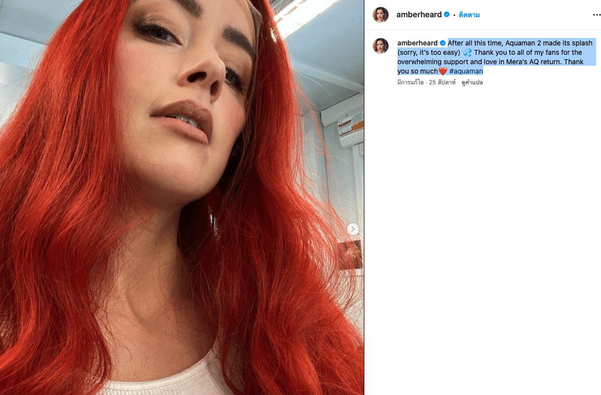 เมื่อตอนต้นปี แอมเบอร์ได้โพสต์ถึงอควาแมน 2 ภาพยนตร์เรื่องสุดท้ายที่ตนเองแสดงว่า “หลังจากที่รอคอยมานาน Aquaman 2 ก็มาแล้วค่าา (ขอโทษด้วยค่ะ พลาดมุกไม่ได้จริงๆ) 💦 ขอบคุณแฟนๆ ทุกคนที่ให้การสนับสนุนและความรักอย่างล้นหลามในการกลับมาของ Mera ใน AQ นะคะ ขอบคุณมากๆ ค่ะ ❤️ #aquaman”