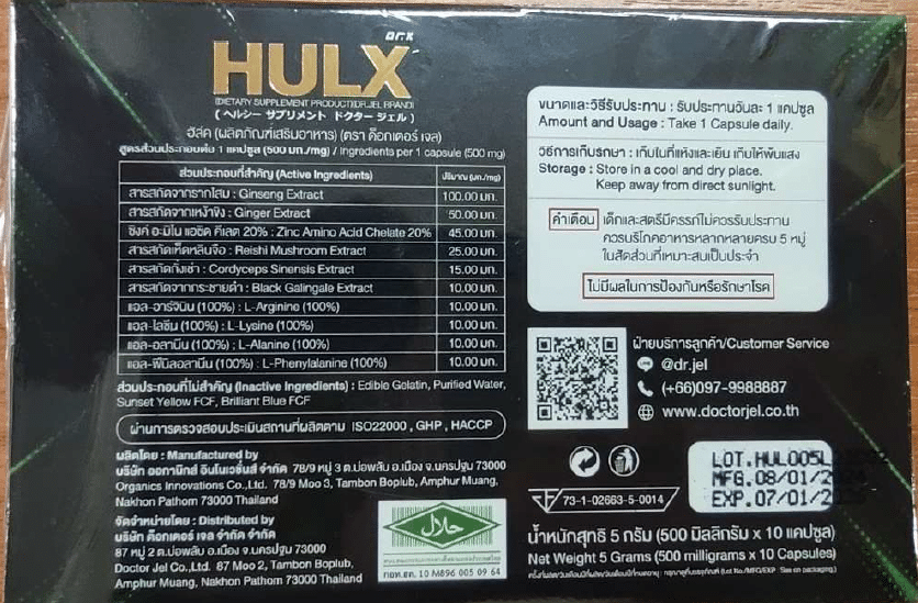 ทาง อย. ได้ซื้อผลิตภัณฑ์อาหาร ประเภทผลิตภัณฑ์เสริมอาหารจากร้านค้าออนไลน์บนแพลตฟอร์ม LINE Official Account “Doctor Jel” ก่อนจะส่งตรวจวิเคราะห์ที่กรมวิทยาศาสตร์การแพทย์ โดยฉลากระบุรายละเอียดผลิตภัณฑ์ ดังนี้ “ฮัล์ค (ผลิตภัณฑ์เสริมอาหาร) (ตรา ด็อกเตอร์ เจล) HULX (DIETARY SUPPLEMENT PRODUCT) (DR.JEL BRAND) อย. 73-1-02663-5-0014 ผลิตโดย : บริษัท ออกานิกส์ อินโนเวชั่นส์ จำกัด 78/9 หมู่ 3 ต.บ่อพลับ อ.เมือง จ.นครปฐม จัดจำหน่ายโดย : บริษัท ด็อกเตอร์ เจล จำกัด 87 หมู่ที่ 2 ต.บ่อพลับ อ.เมือง จ.นครปฐม LOT.HUL005L23802 MFG.08/01/2024 EXP.07/01/2026
